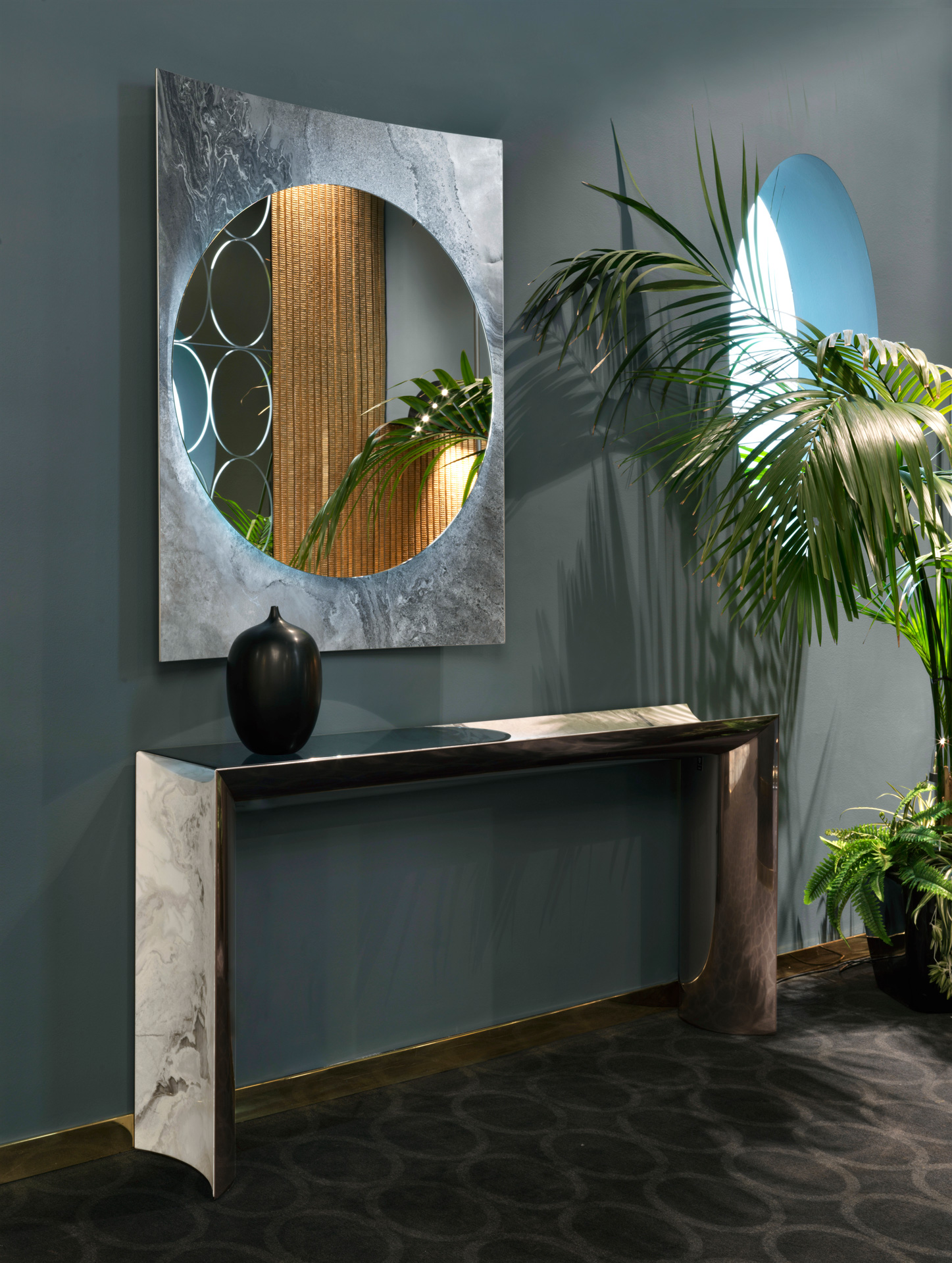 Каркас из гнутого дерева, снаружи покрытый металлическим листом, украшенный цифровой печатью высокого разрешения с имитацией мрамора. Задняя часть покрыта матовым лаком. Подвесное центральное зеркало со светодиодной подсветкой.Характеристики