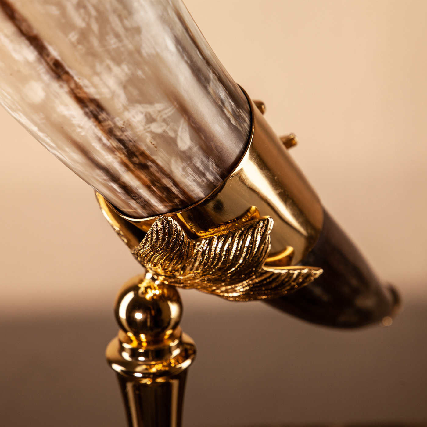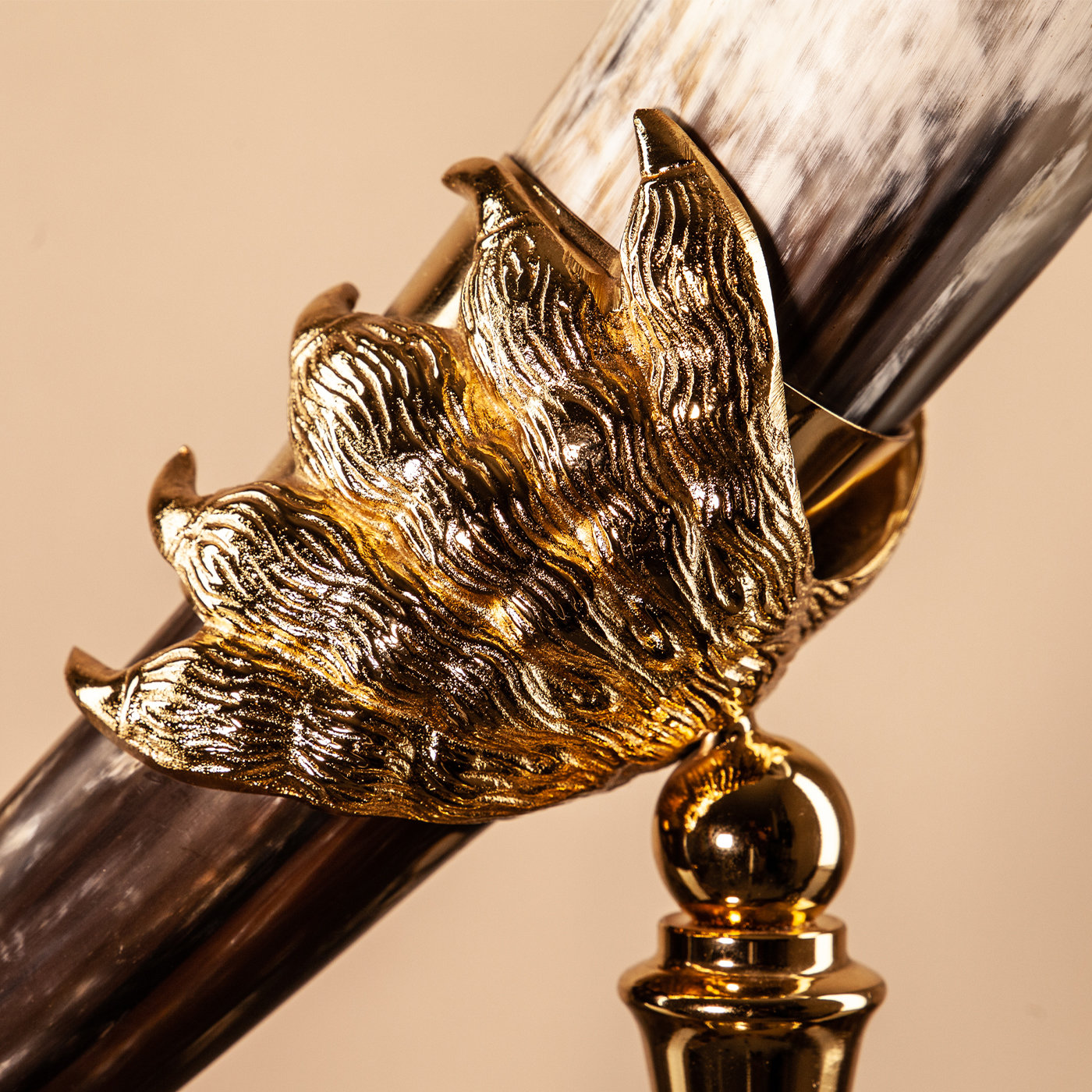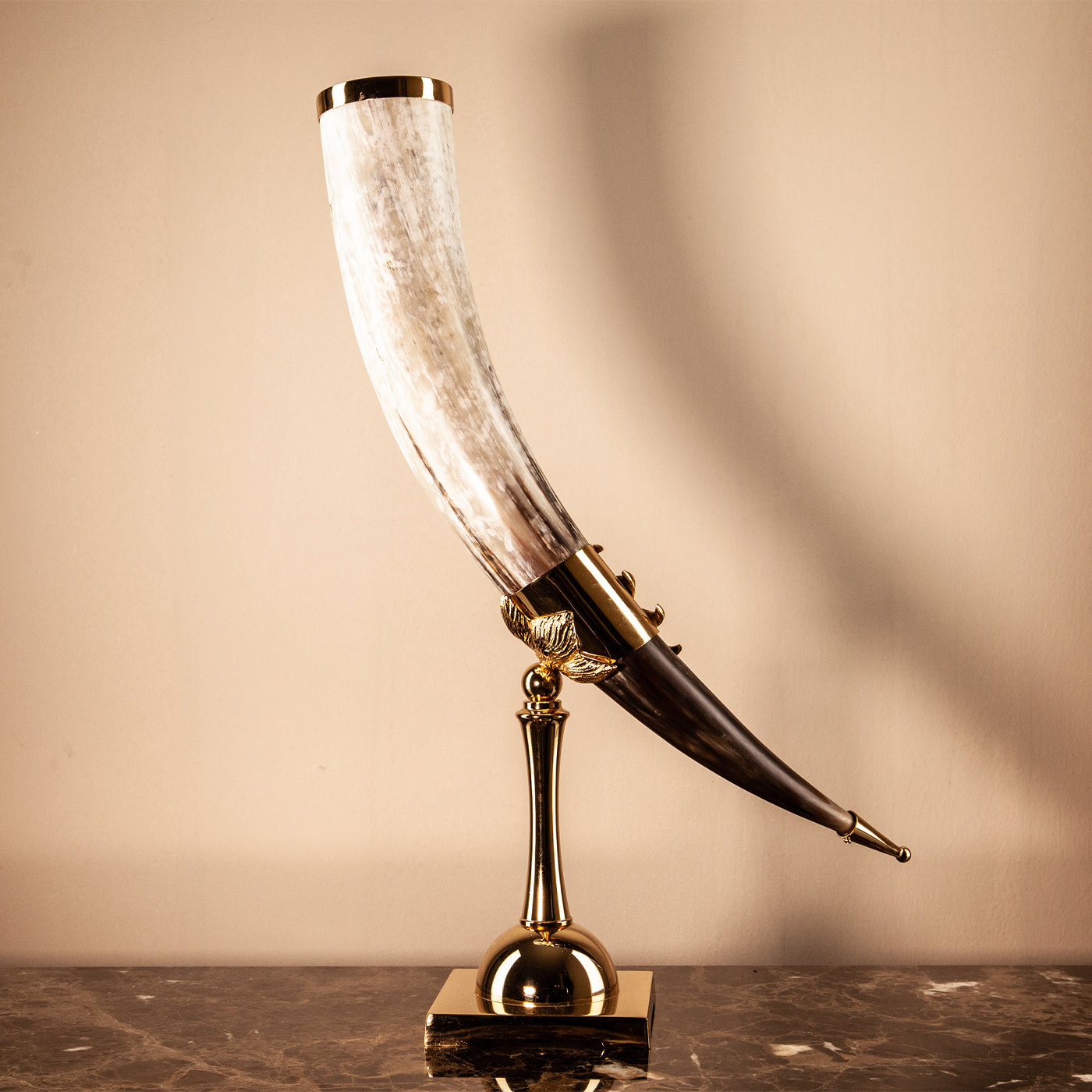 Эта уникальная ваза воплощает в себе эклектичный стиль Redmile в лучшем виде, демонстрируя гламурный эффект за счет сочетания натуральных материалов. Роскошный натуральный рог (около 40 см) держится на орлиной ноге из литой латуни и поднимается на квадратное основание с куполом и тонким стержнем из натуральной полированной латуни. Время естественным образом образует мягкую патину, соответствующую естественному рисунку рога. Этот эксклюзивный предмет из коллекции Corno Vero лучше всего представлен в паре. Он излучает неповторимый характер, который подчеркнет любой интерьер. Цветовые нюансы, размер и форма рожка могут отличаться.Характеристики