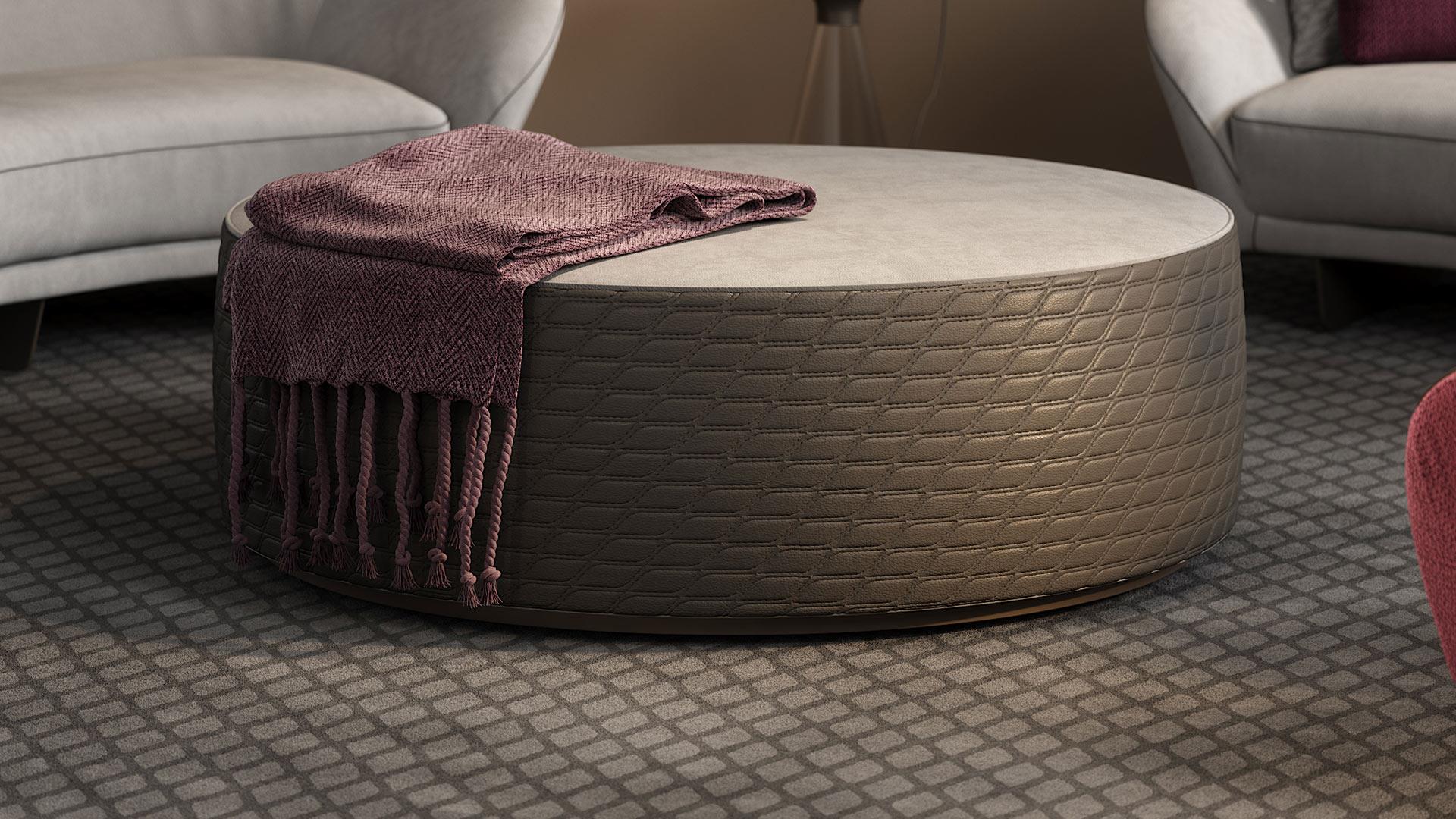 Пуф / низкий столик с внутренней деревянной структурой и цоколем с отделкой под бронзу. Обивка тканью или кожей с возможностью простегивания сбоку.Характеристики