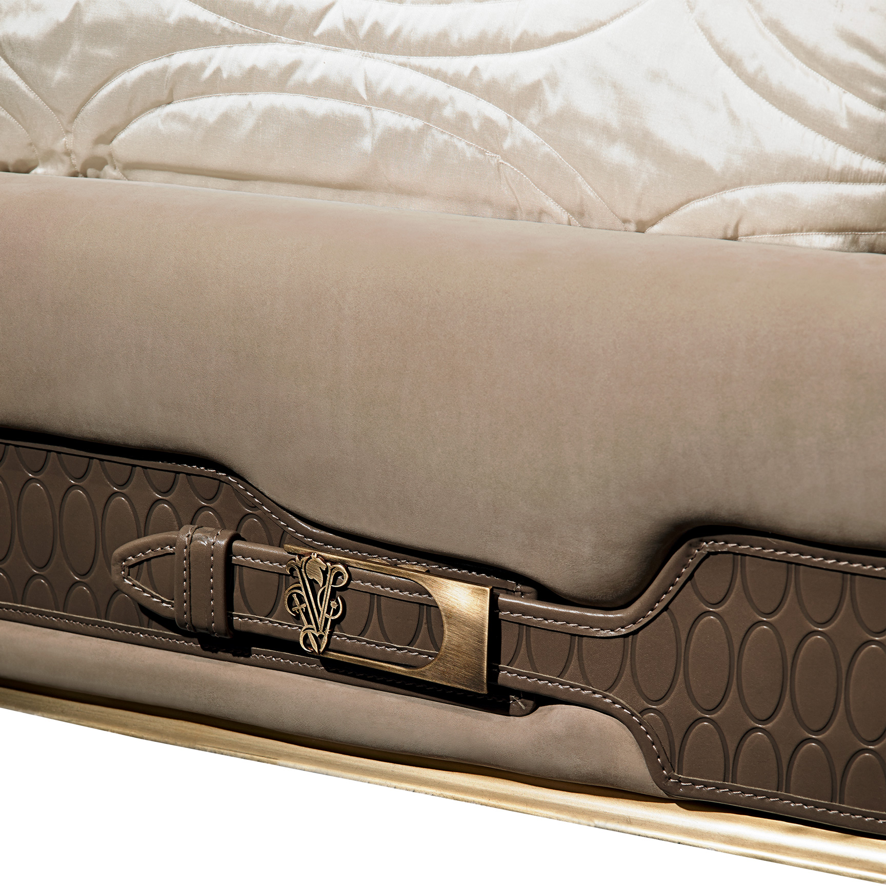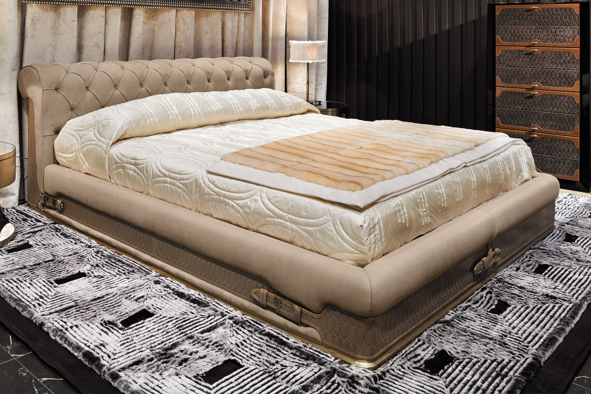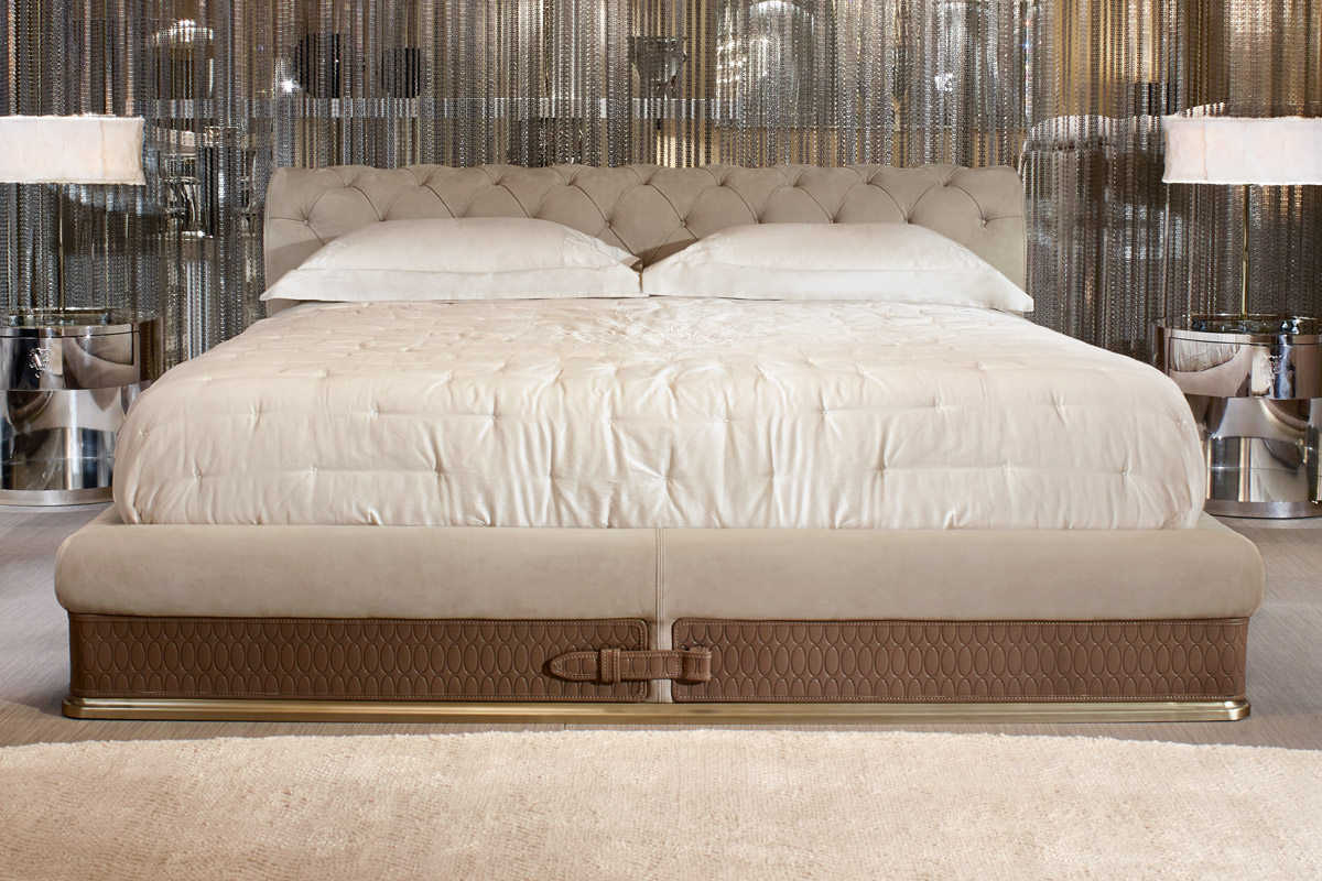 Кровать, обитая тканью или кожей, с изголовьем из капитоне. Конструкция из массива ели и фанеры тополя th. 25 мм. Набивка пенополиуретаном разной плотности. Цоколь из литого хромированного алюминия, покрытого античной латунью. Кожаные полосы по периметру с тиснеными овалами и декоративными пряжками из старинной латуни с логотипом Visionnaire. Четыре угловые опоры и центральная перекладина из окрашенной стали составляют комплектующие для сборки каркаса кровати и ее крепления к изголовью. Регулируемый по высоте каркас кровати является опорой для деревянных реек. Крышка несъемная. Покрывало Дориат.Характеристики