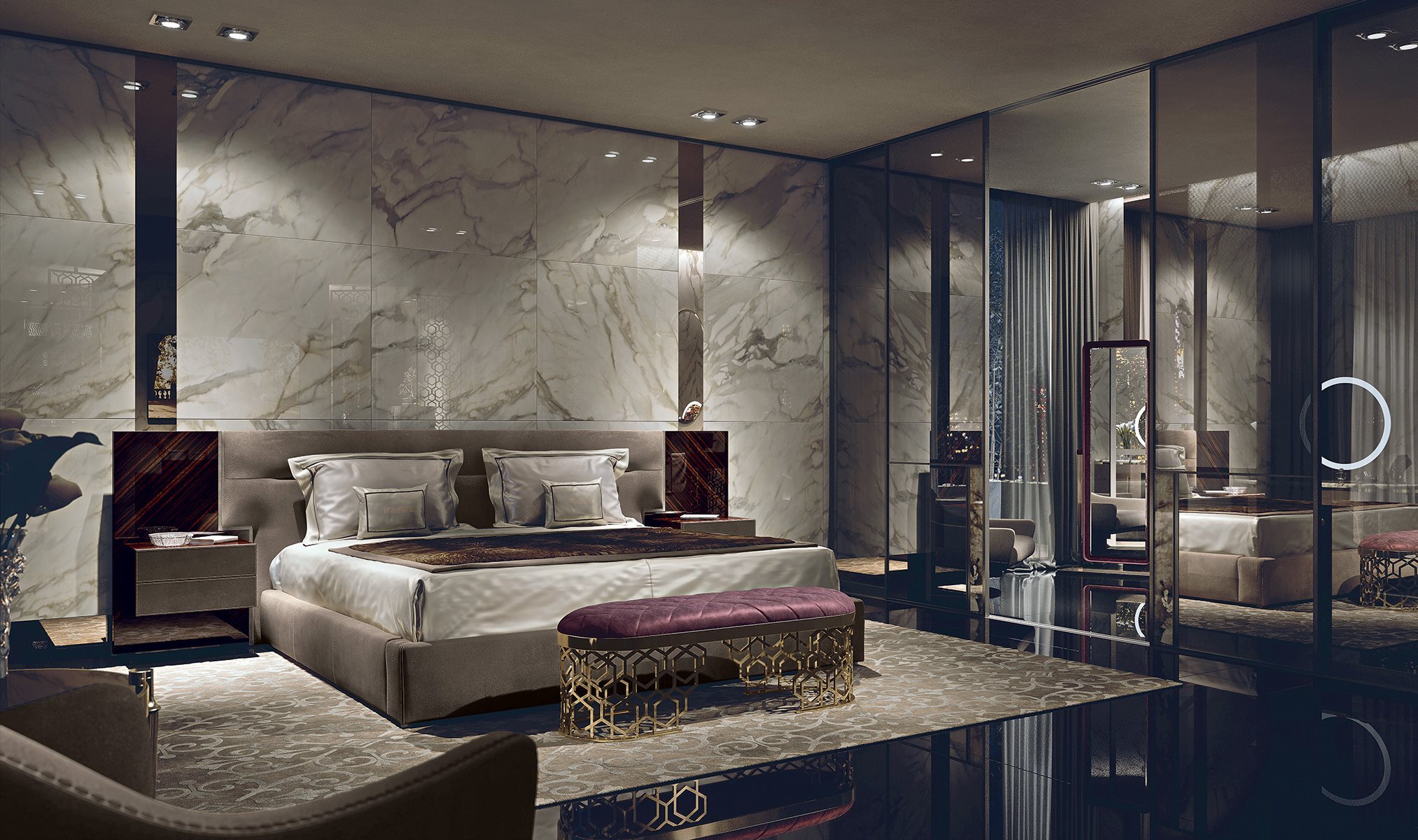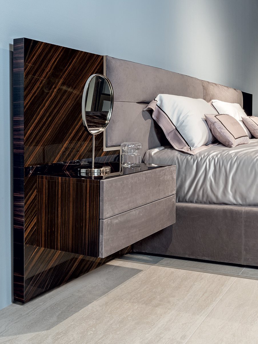ИЗГОЛОВНИК С НОЧНЫМ СТОЛОМДеревянное изголовье покрыто пенополиуританом средней плотности с подкладкой из полимерной смолы, что обеспечивает приятную мягкость поверхности. Обивка изголовья - кожа или ткань из ассортимента. Деревянные панели буазери расположены по бокам от изголовья, а прикроватный столик вставлен в отделку: глянцевый цвет слоновой кости Sycamore frisè, глянцевое черное дерево, глянцевый орех Canaletto, глянцевое дерево Берл или глянцевый лак Sucupira Luxury в глянцевой цветовой гамме. У прикроватного столика фасады ящиков обтянуты кожей из этой коллекции, внутренняя часть покрыта матовой бронзой и металлическими вставками в цветах: ярко-коричневый, ярко-светлое золото, матовое золото цвета шампанского, глянцевый хром, глянцевый черный хром, матовая сатинированная бронза, глянцевый розовое золото, матовое розовое золото, черное розовое золото.
