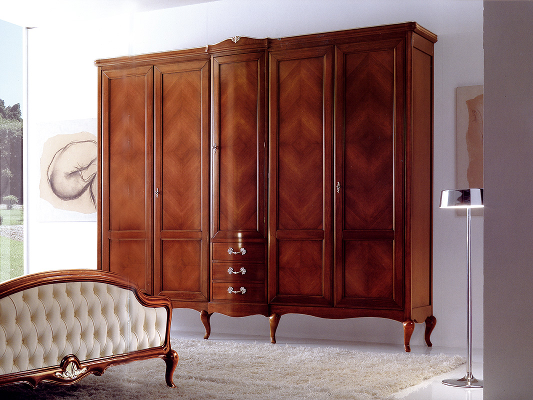 Шкаф с пятью распашными дверцами и тремя выдвижными ящиками. Украшен резьбой. Возможны другие варианты отделки.Характеристики