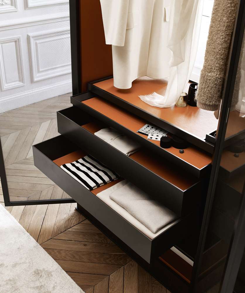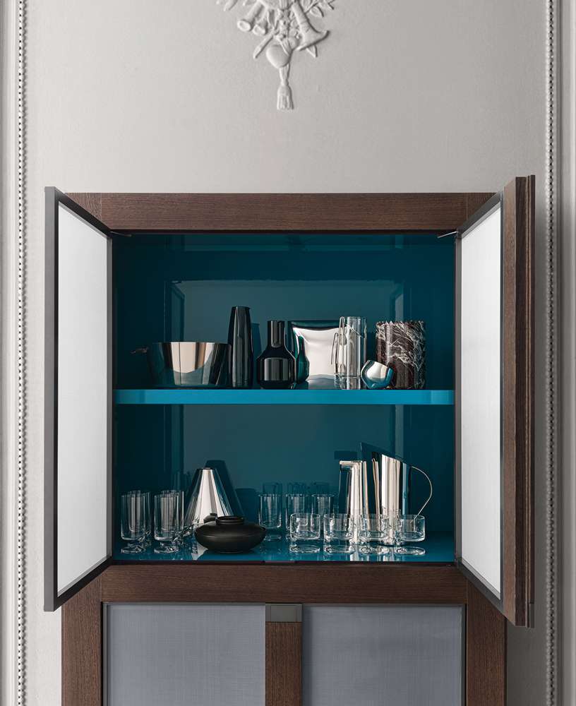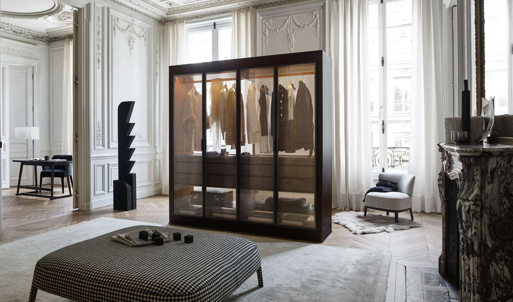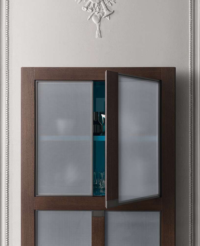 Серия Eracle простирается из гостиной в спальню с необычным блоком хранения строго калиброванных пропорций, очень простым в использовании. Новый том, также в двухсторонней версии, имеет те же характеристики, определяющие единицы хранения для гостиной: тома, двери и задние панели с соединенным прозрачным стеклом (с высокотехнологичной внутренней тканью) и бронзовые никелевые края. Прекрасные материалы гарантируют минимальный и сложный вид также на новый элемент: рамка изготовлена из матового света дуба, серый дуб, матовый черный дуб, копченый дуб и естественную венге; Внутри покрыты колониевой кожаной меламином, с которыми сталкиваются и оснащены бронзовым никелем окрашенным комодом. Лотки и рельсы для одежды, покрытые кожей колониале, а также полный спектр аксессуаров, предлагают широкий спектр решений для персонализации. Свет, помещенный внутри устройства, - это изысканная старинная деталь, напоминающая мебель дисплея 1950-х годов.Характеристики