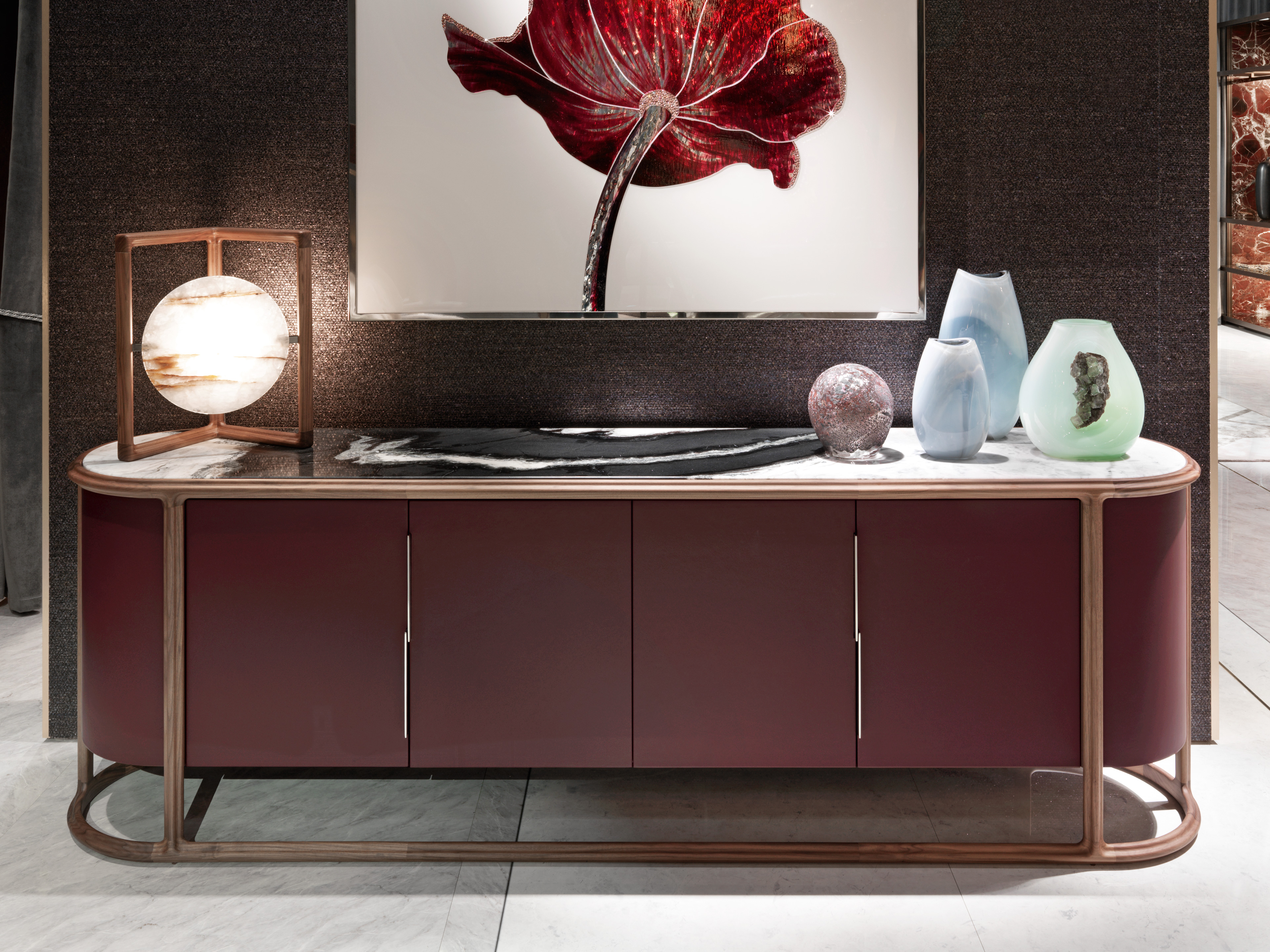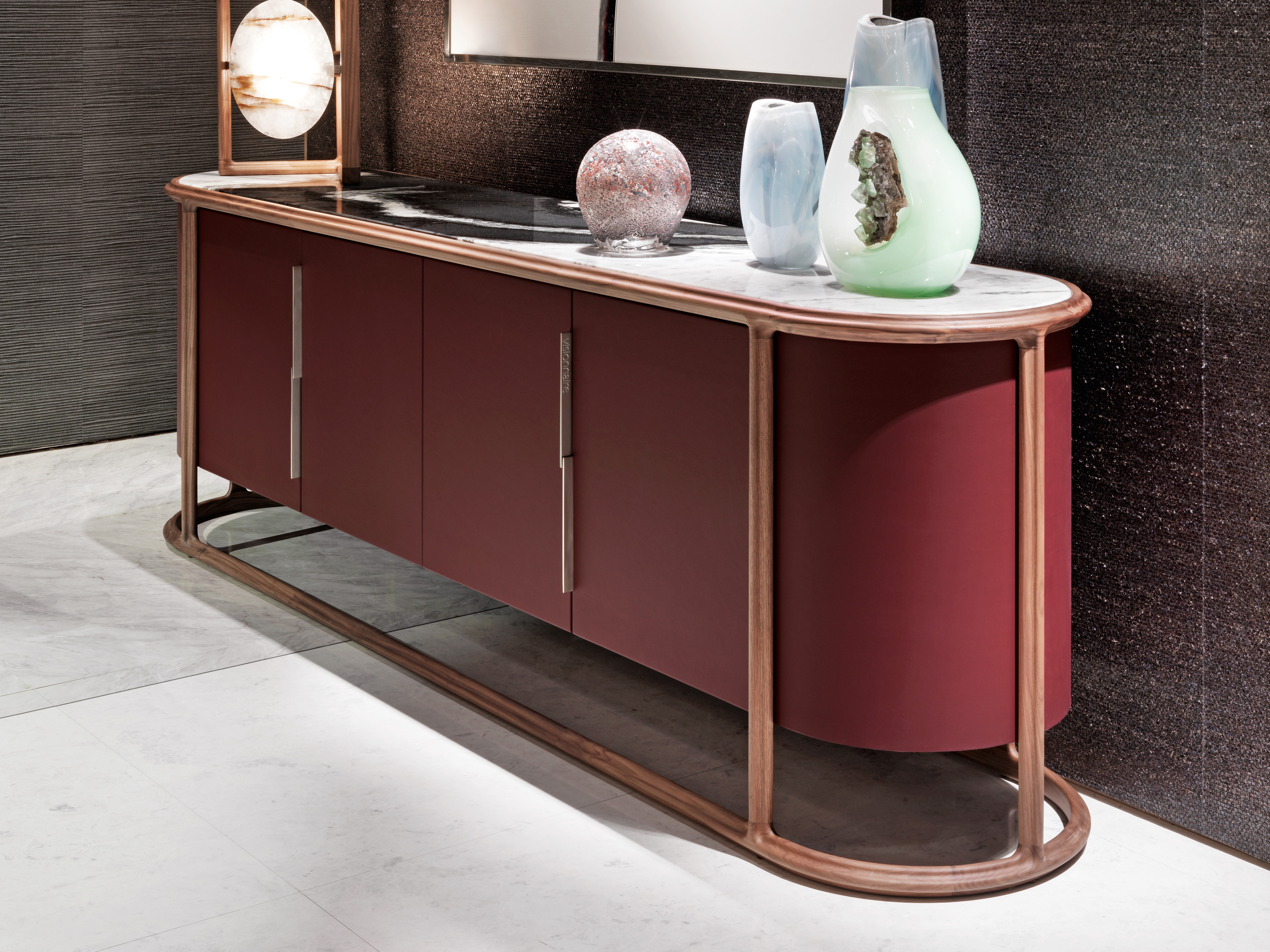 Низкий шкаф с дверцами и загнутыми стенками. Несущая рама из массива ореха Каналетто с открытыми порами натуральной отделкой и профилированной трехлепестковой секцией; деревянная конструкция с дверцами и изогнутыми стенками, доступна с блестящей лаковой отделкой RAL / NCS или с кожаной обивкой. Ручки из атласного металла. Внутренняя отделка матовым лаком RAL / NCS. Встроенная мраморная столешница. Доступны внутренние светодиодные фонари. Ручки могут быть покрыты любым лаком по выбору лакокрасочного покрытия по металлу.Характеристики