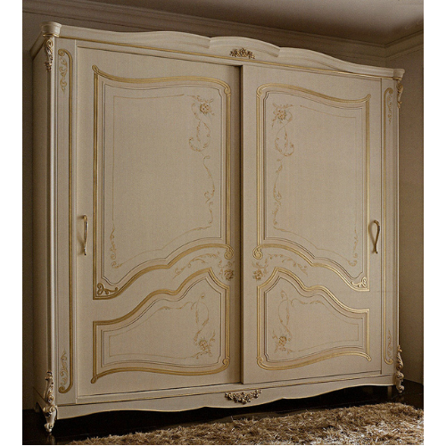 Шкаф с 2 раздвижными дверцами. Декорирован росписью и резьбой. Внутреннее оснащение: 3 полки, 1 тумба с 3 выдвижными ящиками и 3 вешалки. Возможны другие варианты отделки.Характеристики