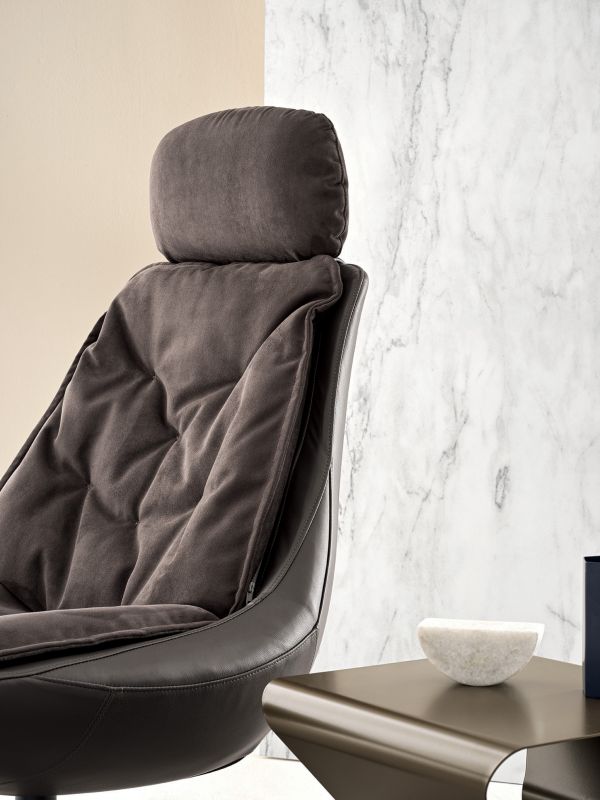 Съемное кресло с вращающимся центральным основанием из лакированной или хромированной стали, технический бархат, гибкое литье из холодного литья, эластичная огнеупорная полиуретановая подкладка, монолитное сиденье из стеганой экокожи, ткани, бархата и тонкой кожи.Характеристики
