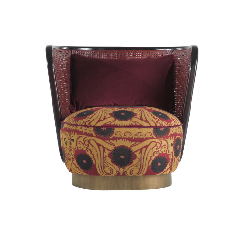Кресло с мягкими обволакивающими линиями, низкое и удобное сиденье которого по форме напоминает экзотику традиционной оттоманки. Обивка из жаккардовой ткани Бухара с узором Сюзани создает гармоничный контраст с легкостью веерообразной тростниковой спинки интенсивного вишнево-красного цвета. Каркас спинки из дерева, окрашенного в темный цвет венге, с тростью, покрытой лаком Cherry Red. Сиденье из поролона с обивкой из ткани кат. В Бухарском пер. 1 Кочевник. Бархатная окантовка кота. Во Флоренции с. 1 изюм. Основание из патинированного дерева под бронзу. В комплекте набор подушек 1 L 50 D 30 Ткань кат. Во Флоренции с. 1 изюм. Пожалуйста, спросите у консьержа о возможностях индивидуальной настройки.Характеристики