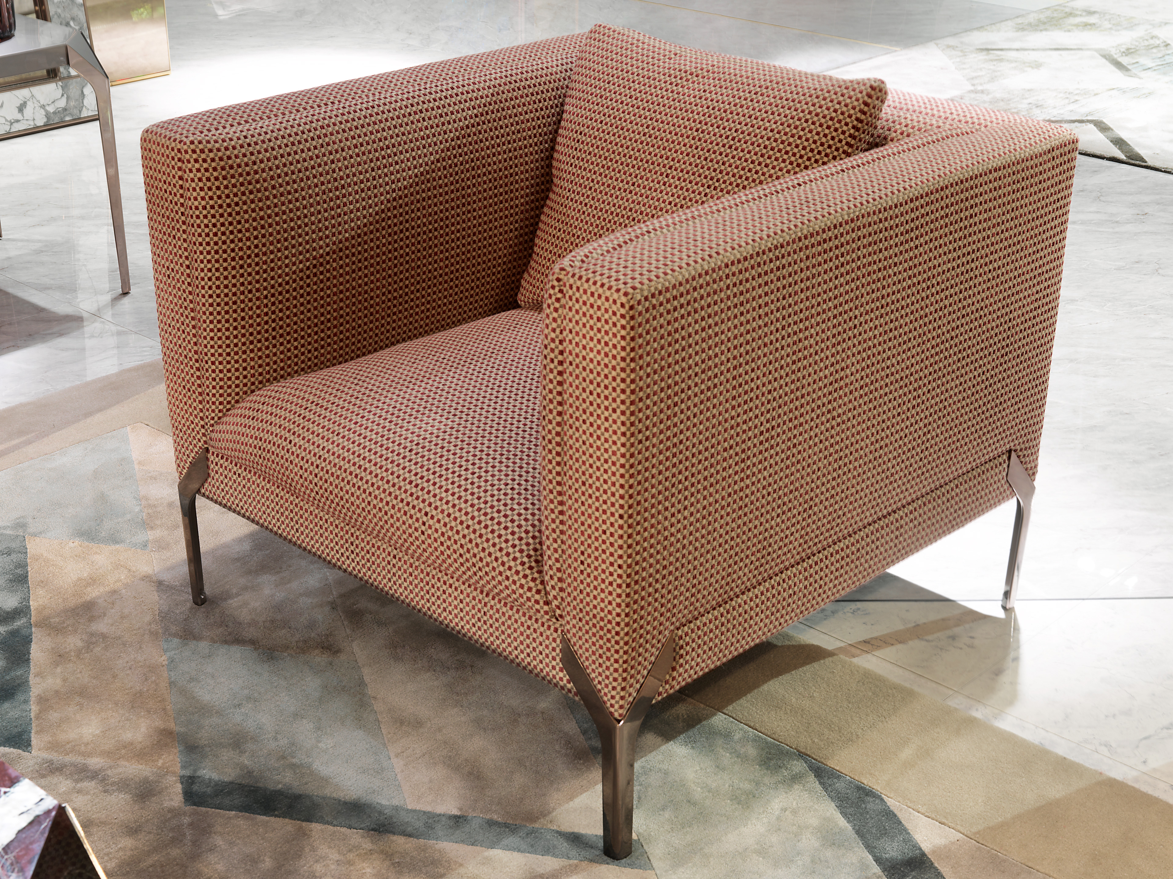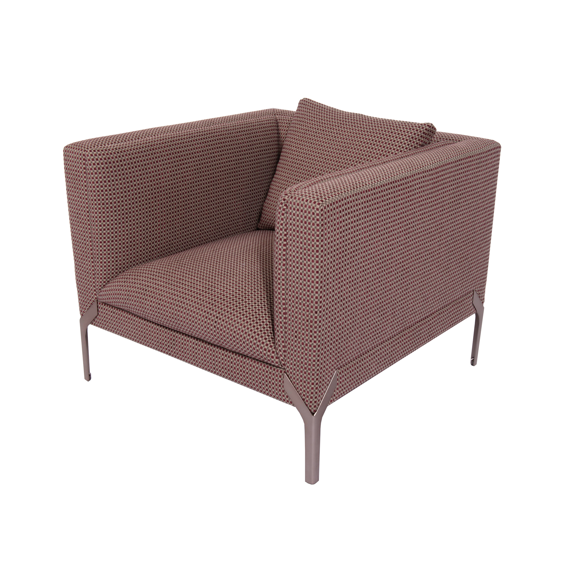 Маленькое кресло с несъемной обивкой из кожи или ткани; каркас из фанеры и массива дерева с эластичными лямками; набивка из полиуретана различной плотности, Memory Foam® и пера. Внешняя конструкция состоит из слегка набитых панелей, покрытых обивкой. Свободные подушки из перьев. Ножки из нержавеющей стали в форме ласточкина хвоста. Металлические детали могут быть покрыты любым лаком на выбор.Характеристики
