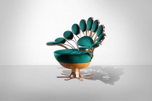 Кресло из кожи или ткани, внешняя конструкция из латуни и стали, подлокотники и спинка состоят из элементов в форме венчика из лепестков, выполненных из литой латуни с ручной полировкой и с мягкими подушками. Сиденье и небольшая подушка спинки обиты пенополиуретаном разной плотности и акриловым волокном. Нижняя часть сиденья из дерева, обтянутая кожей, а основание из хромированного металла. Металлические детали можно покрыть лаком любого цвета, входящего в выбор металлической отделки.Характеристики