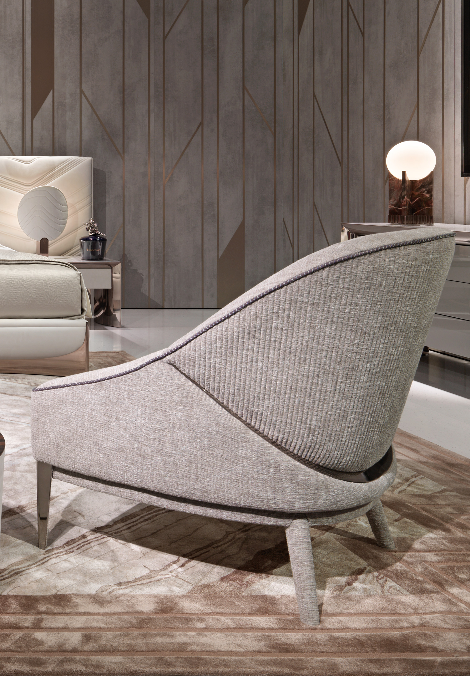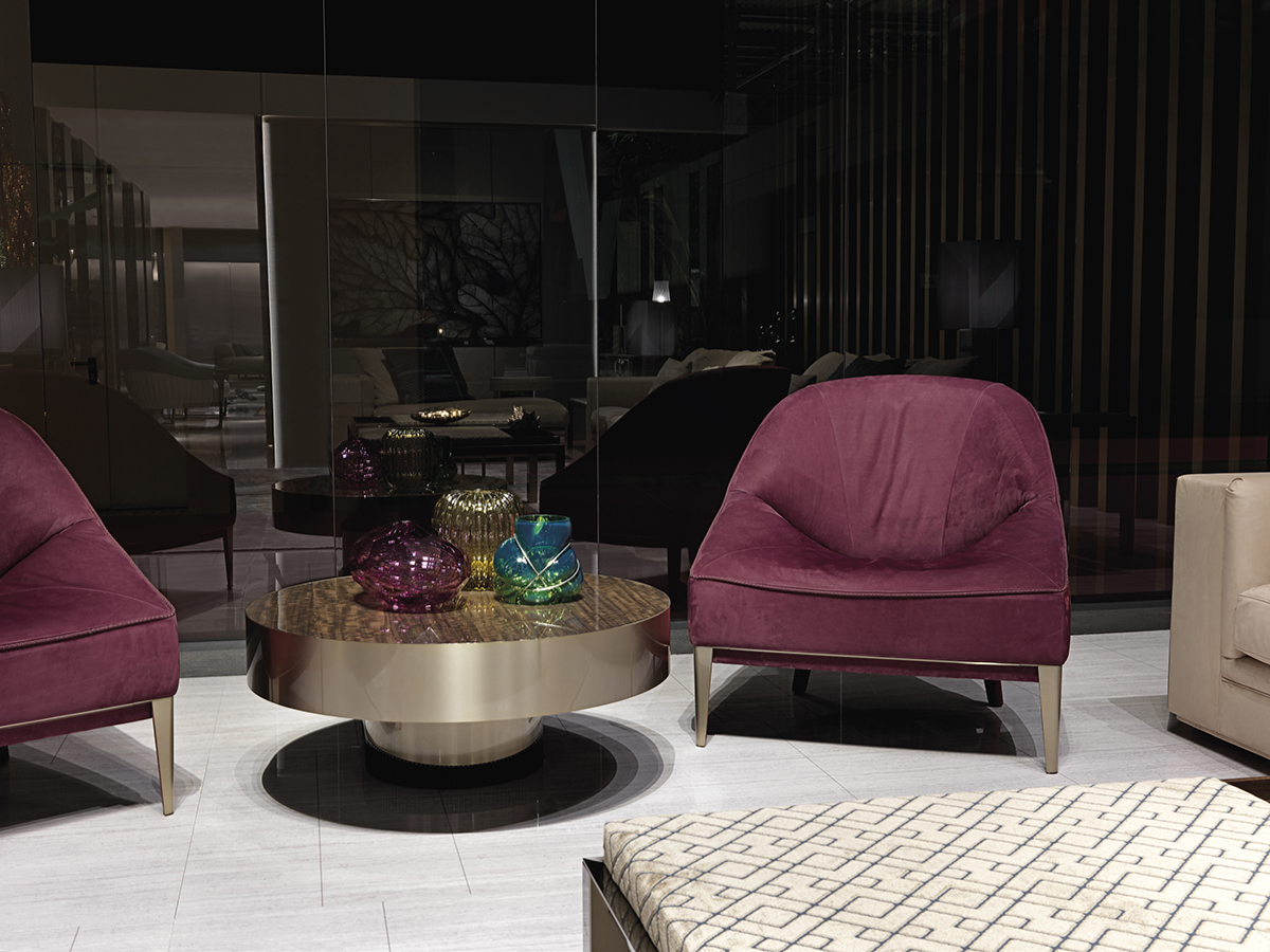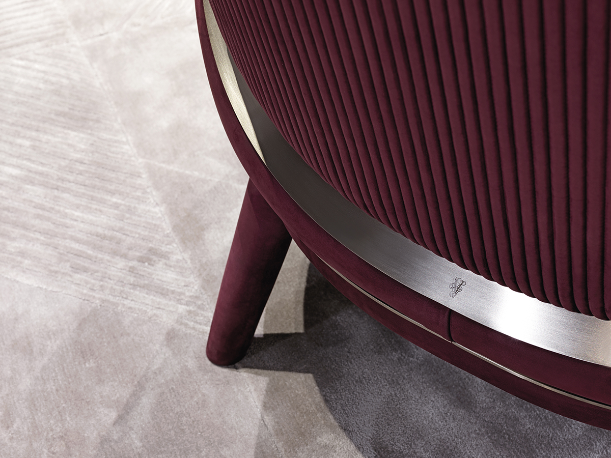 Конструкция сиденья и спинки из гнутой фанеры, пружинная система эластичных ремней; Основание из фанеры из тополя и массива бука, обивка из кожи или ткани. Внутренняя набивка из полиуретана разной плотности и пены с эффектом памяти Memory Foam®, встроенная в перьестойкую подкладку, наполненную пухом. Наружная обивка простегана с мотивом канне. Декоративные фризы и передние ножки из сатинированной нержавеющей стали. Металлические детали доступны с отделкой из сатинированного металла.Характеристики