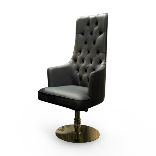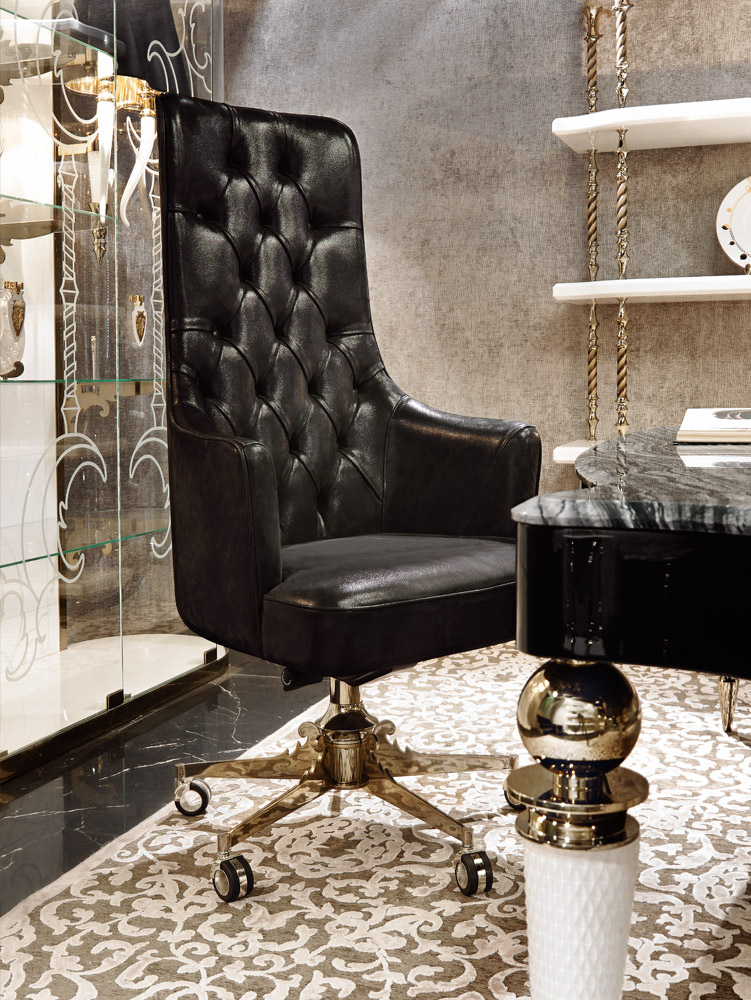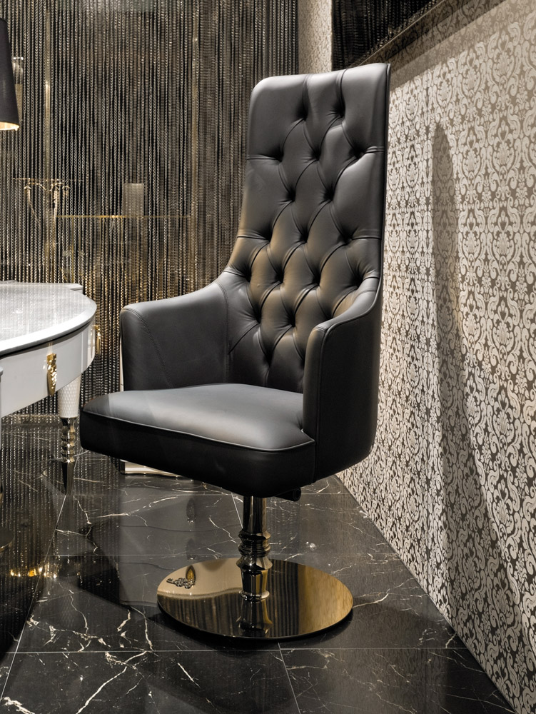 Поворотное мягкое кресло, обитое кожей или тканью. Каркас из гнутой фанеры. Набивка из пенополиуретана. Подрессоренная система сиденья с эластичными ремнями. Основание из сплавленного алюминия с декоративной пластиной из нержавеющей стали, блестящая отделка, с гербом Visionnaire из латуни. Основная опора из латуни с алюминиевой стружкой. Оснащен механизмом регулировки высоты и наклона. ТАКЖЕ ЕСТЬ В НАЛИЧИИ база из полированной нержавеющей стали с 5-ю спицами для лазерной отделки. Хромированный или покрытый золотом 8 мм, с колесами и хромированными или покрытыми золотом алюминиевыми точками. Основание представляет собой поворотный амортизирующий поршень с системой наклона. Металлические детали доступны в выборе отделки металлом.Характеристики