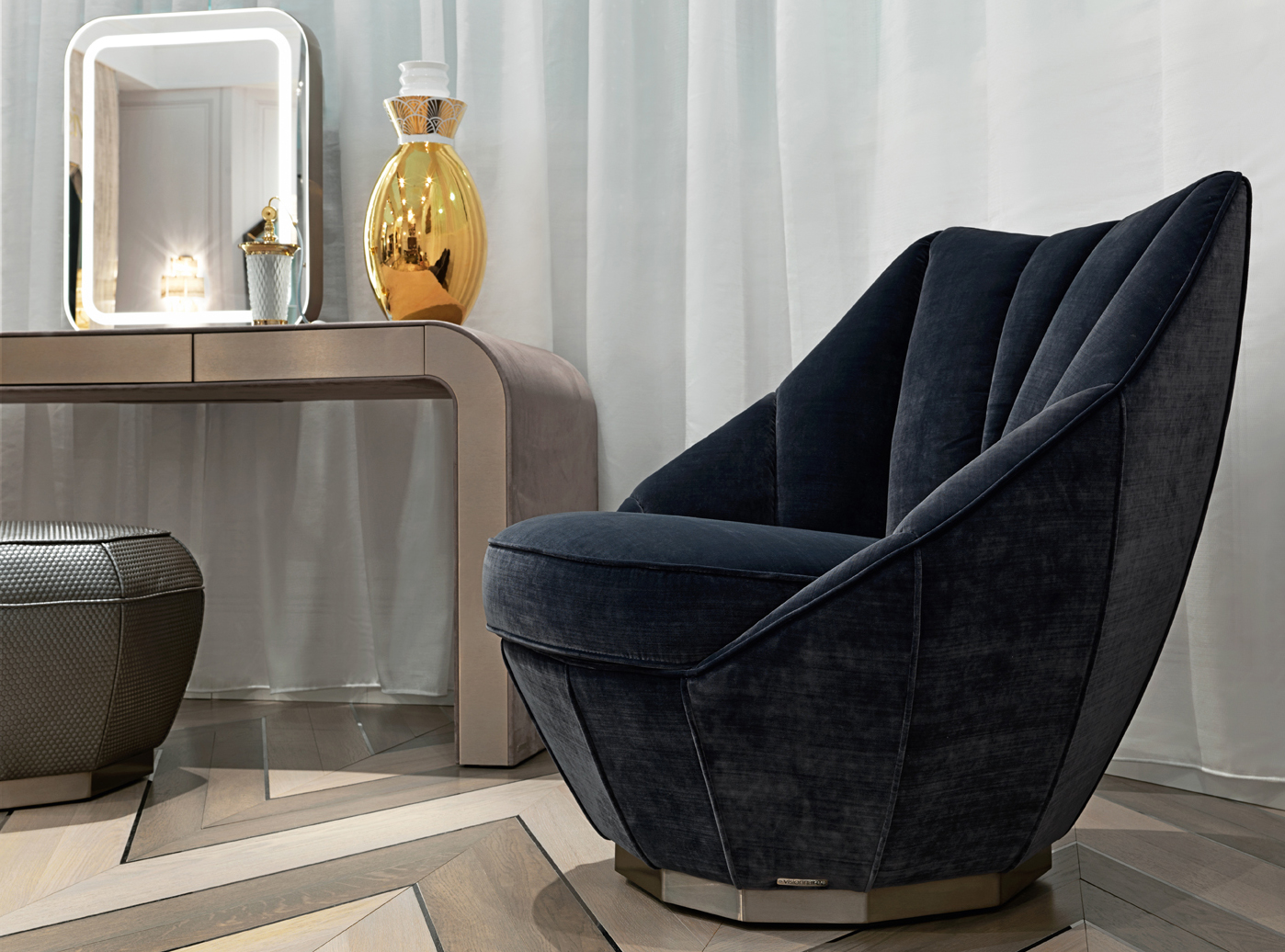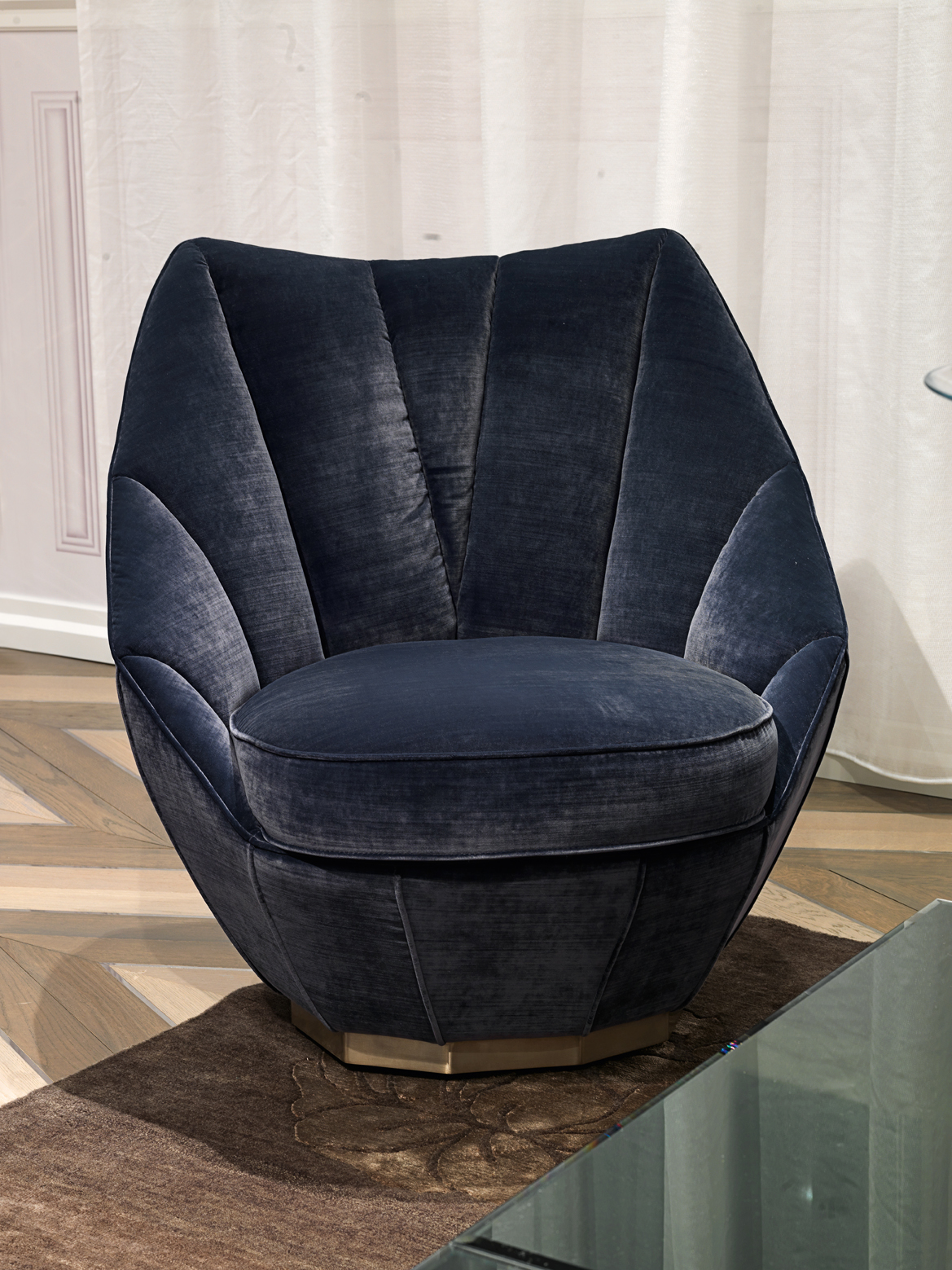 Структура в форме ромба из массива дерева и фанеры, сиденье с пружинной системой с ремнями и набивкой из полиуретана, Memory Foam® и акрилового волокна. Внутренние части спинки из полиуретана и акриловых волокон с индивидуальной подкладкой. Многогранное основание из полированной нержавеющей стали доступно в вариантах хрома, золота, шампанского, бронзы, сиены, черного никеля и бронзы.Характеристики