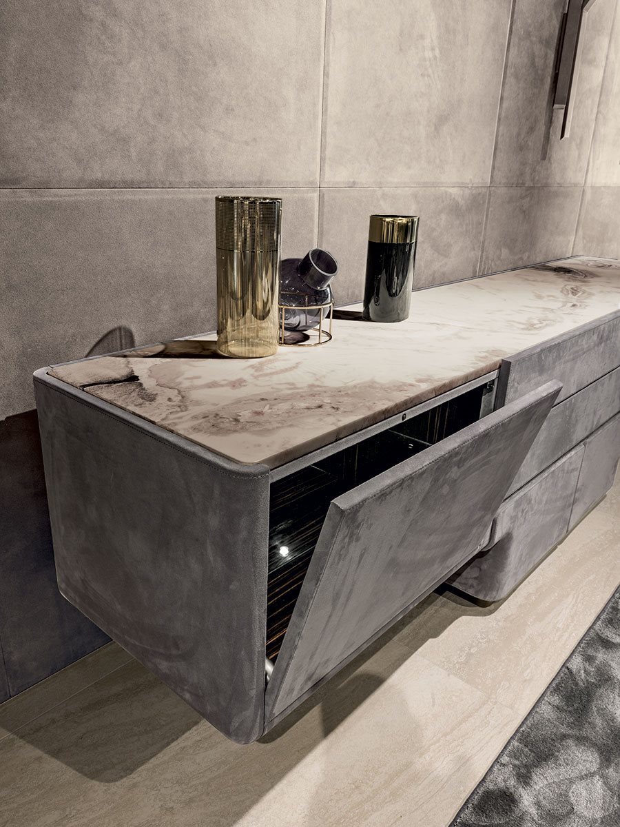 Боковые шкафы имеют откидные двери со светодиодной подсветкой и внутреннюю отделку из дерева: глянцевое / матовое Ebony, глянцевое / матовое фризе Sycamore или глянцевое / матовое ореховое дерево Canaletto. Внутренние части ящиков окрашены в матовую бронзу с открыванием push-pull.
