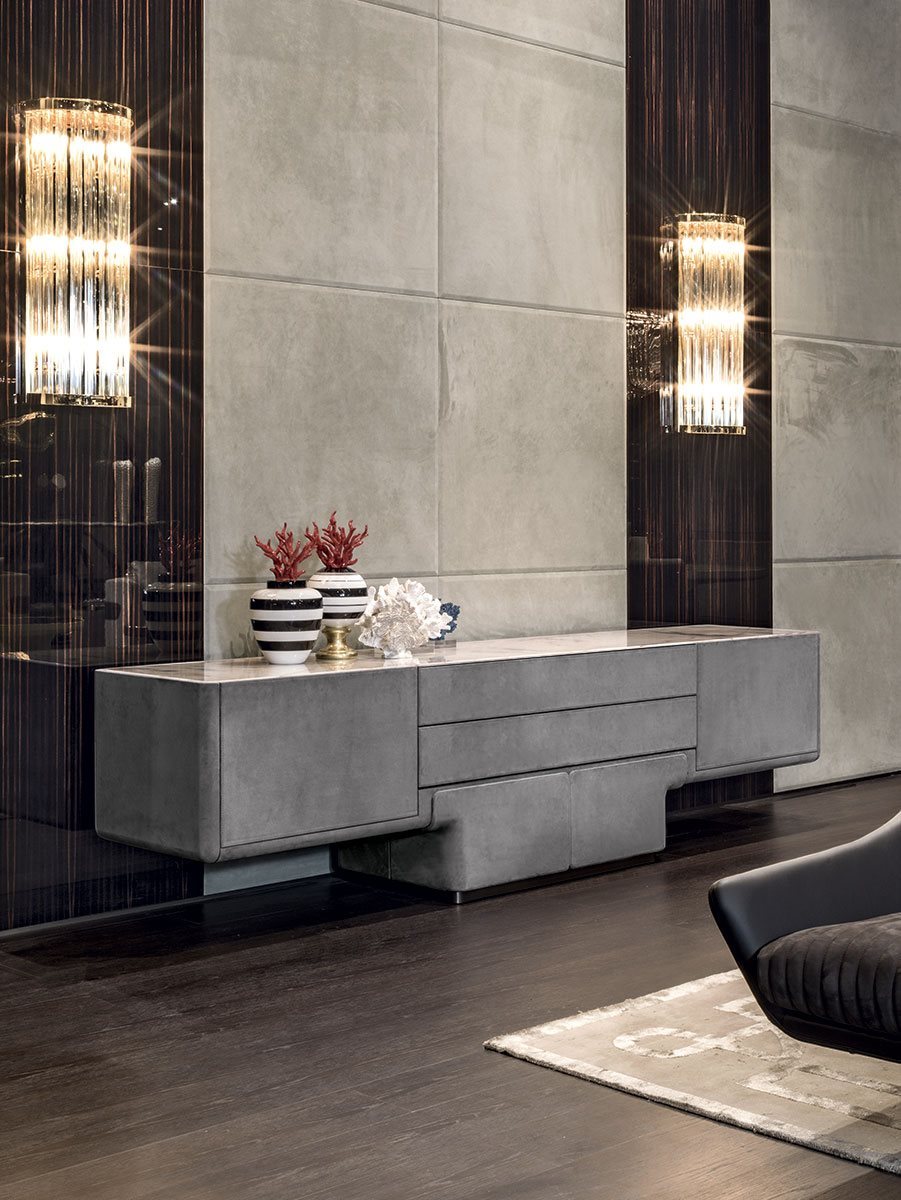 Шкаф для гостиной с основанием из стекловолокна ручной формовки. Плинтус и кромки из шлифованного металла со следующей отделкой: ярко-коричневый, ярко-светлое золото, матовое золото цвета шампанского, глянцевый хром, яркий черный хром, матовая сатинированная бронза, ярко-розовое золото, матовое розовое золото, золото Black Rose. Структура (из МДФ толщиной 40 мм) особой формы, покрытая кожей из каталога.