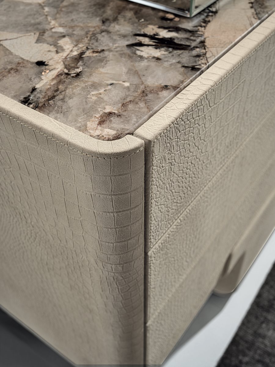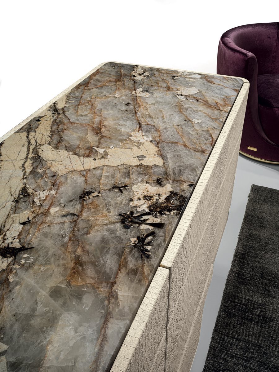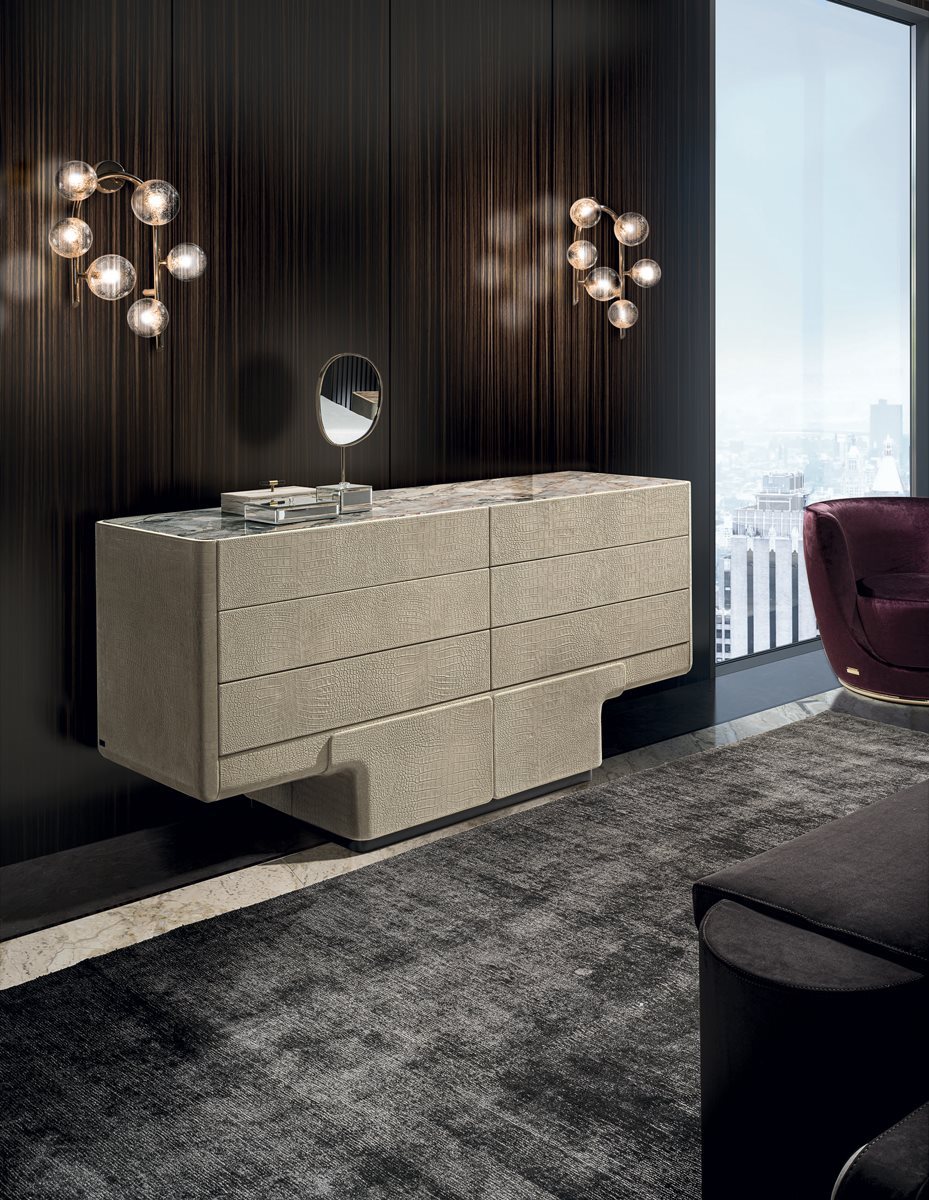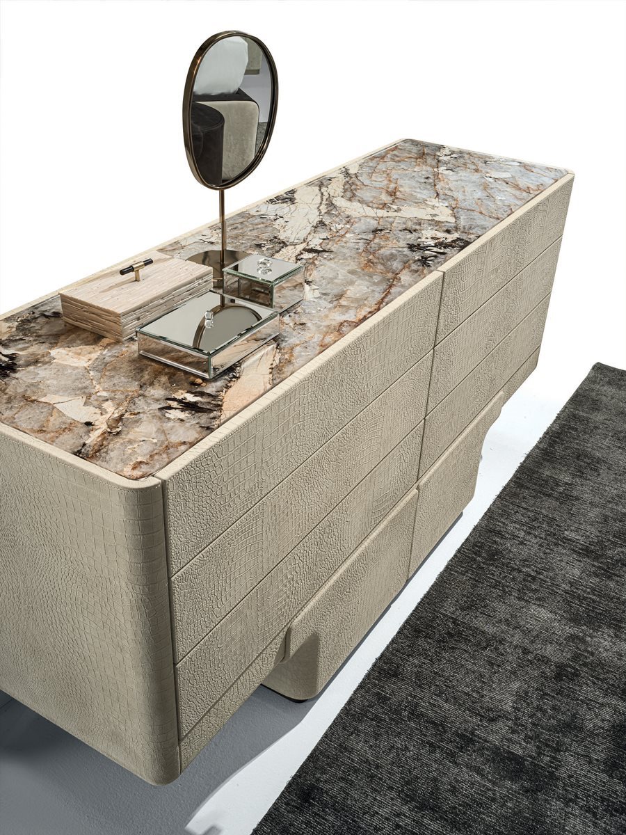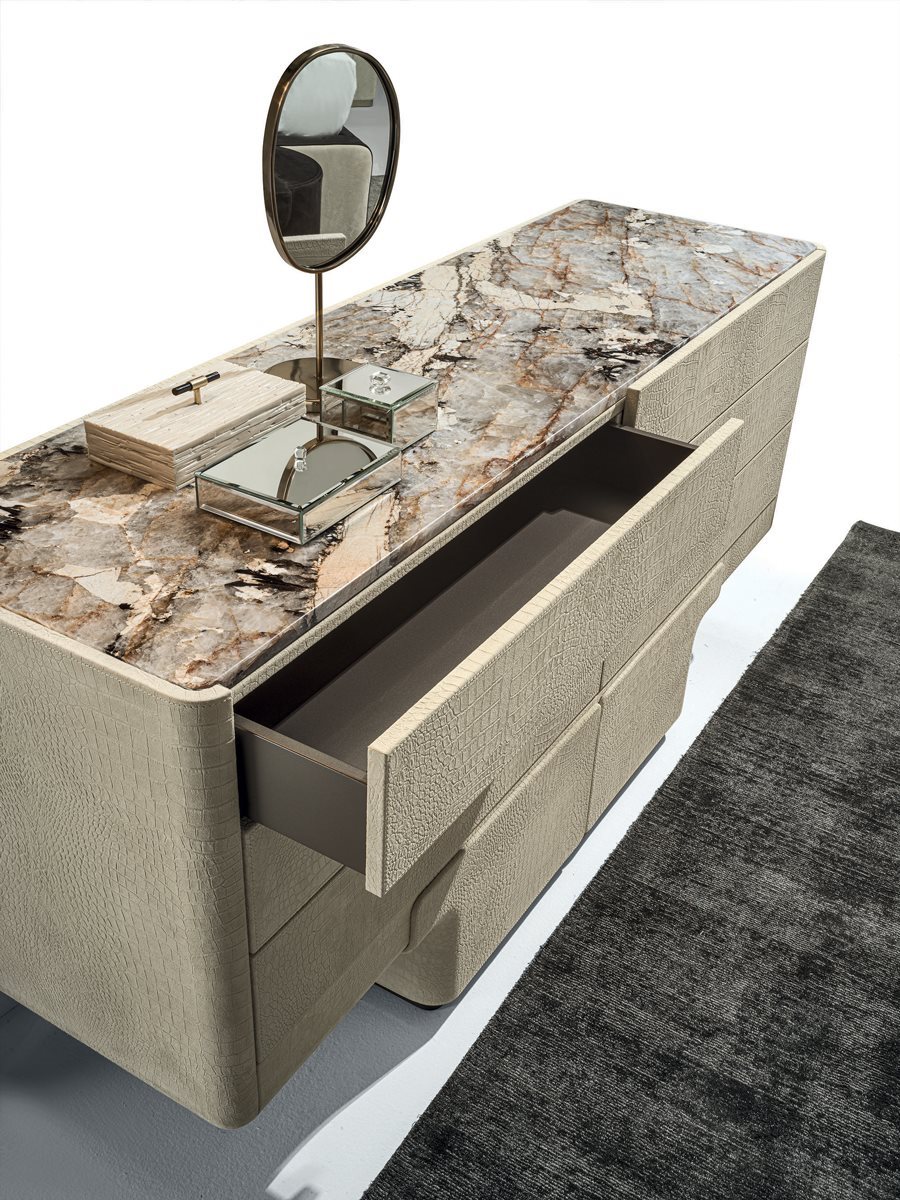 Комод с 6 ящиками с основанием из стекловолокна ручной формовки. Плинтус с шлифованной металлической кромкой в следующих вариантах отделки: черное розовое золото, ярко-коричневый оттенок, яркое светлое золото, матовое золото цвета шампанского, глянцевый хром, яркий черный хром, матовая сатинированная бронза, яркое розовое золото, матовое розовое золото. Конструкция (из МДФ, толщина 40 мм) особой формы, обтянутая кожей из каталога. Отверстие Push-Pull и внутренняя поверхность покрыты матовым бронзовым лаком. Верхняя отделка: бронза или дымчатое зеркало, мрамор Portoro (разделенный на 2 шт.), Мрамор Sahara Noir (полиэфирная отделка), мрамор Dover White, мрамор Panda White, мрамор Guatemala Green, мрамор Corteccia, мрамор Port Saint Laurent, мрамор Red Levanto, Мрамор Bardiglio Nuvolato, мрамор Elegant Brown, мрамор Shale Rosewood, мрамор Emperador Dark, мрамор Silver Wave, мрамор Agatha Black, мрамор Frappuccino, мрамор Calacatta Gold, мрамор Fusion Light, мрамор Patagonia, мрамор Explosion Blue, мрамор Fusion Multicolor, мрамор Juliet Quartz. Или из дерева с отделкой: глянцевое / матовое эбеновое дерево, глянцевый / матовый Sycamore frisè, глянцевый / матовый орех Canaletto.Характеристики