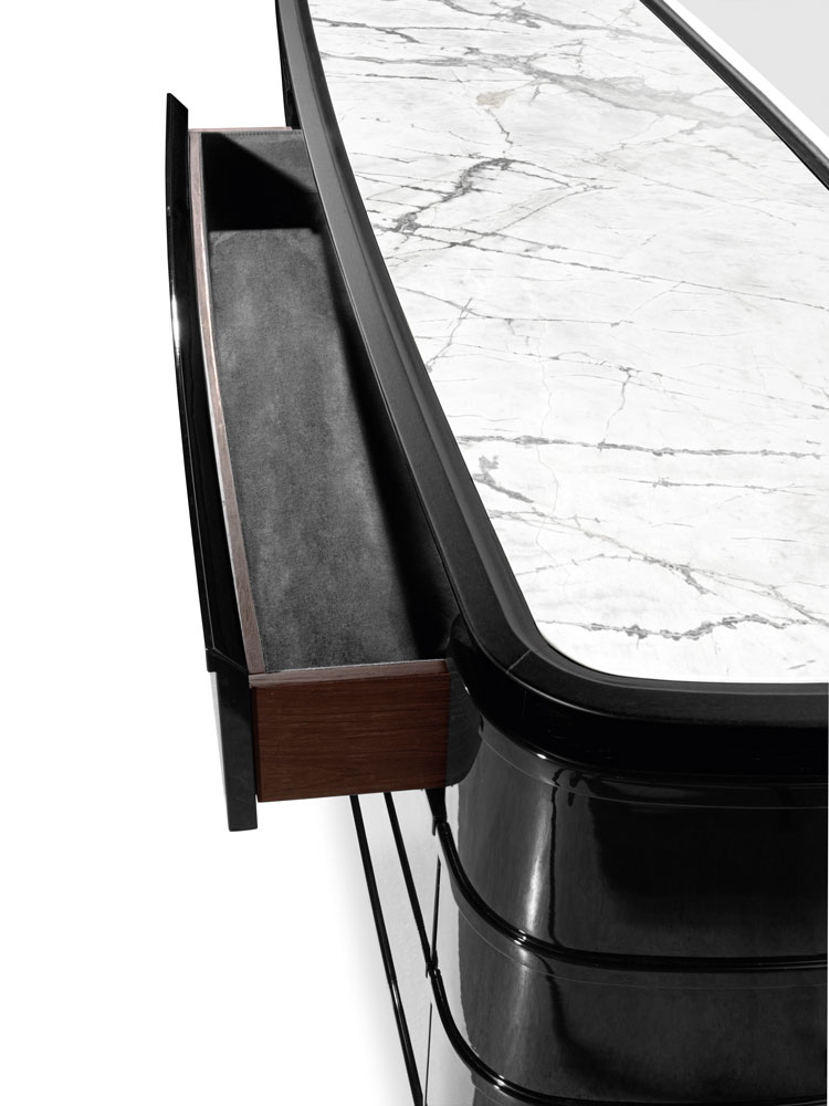 Комод с 6 ящиками с полуэллиптическим центральным корпусом из гнутого дерева со всех сторон, внешняя поверхность с приподнятыми профилями, глянцевая лакированная поверхность. Столешница из мрамора вставлена в каркас из массива дуба с черными открытыми порами. Коническая основа из черного дерева и нижний профиль из сатинированного металла. Внутренние ящики из черного дуба и черного микроволокна внутри. Также доступна версия «Wall» с плоской спинкой.Характеристики