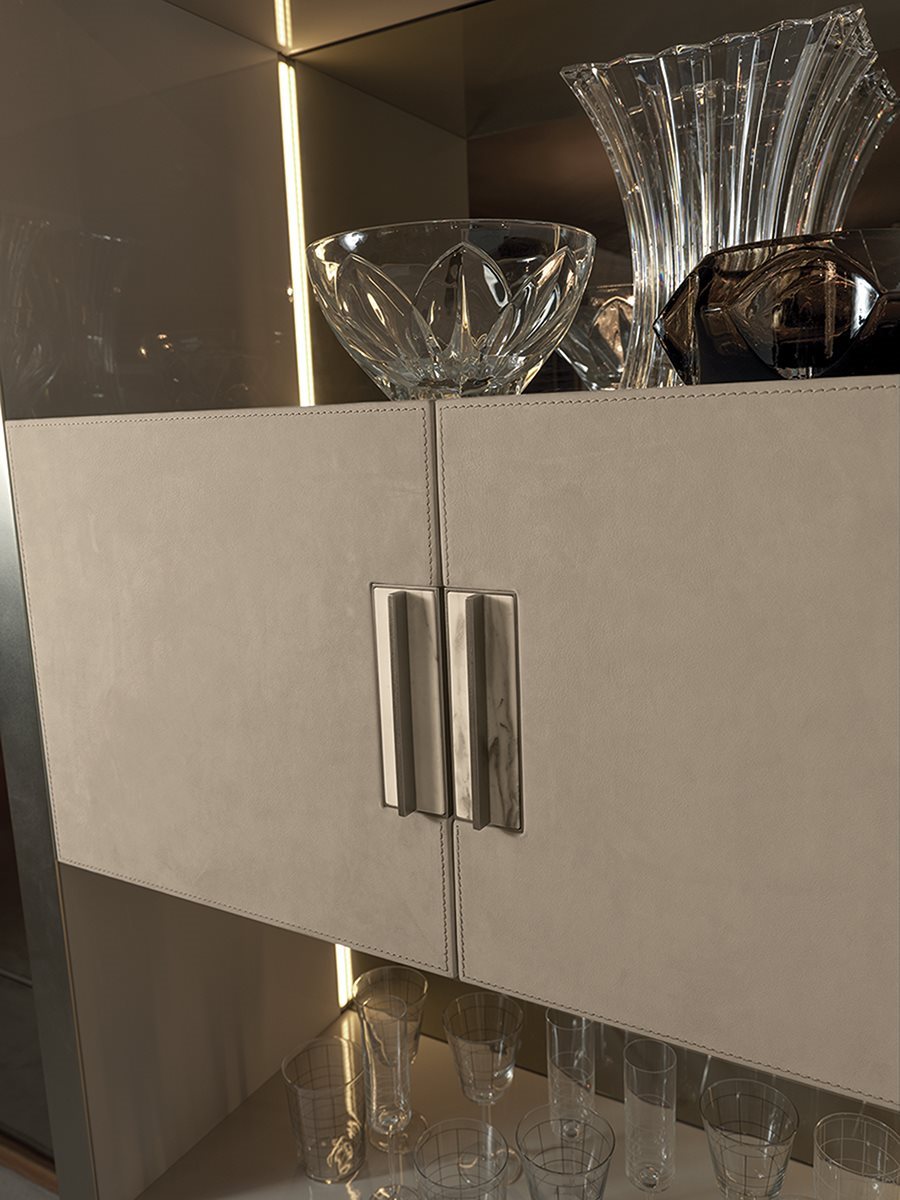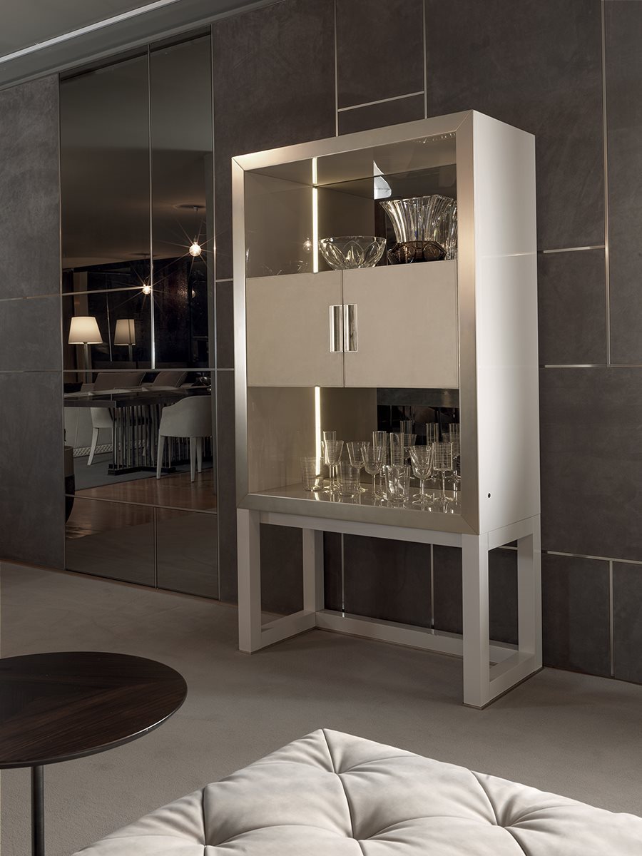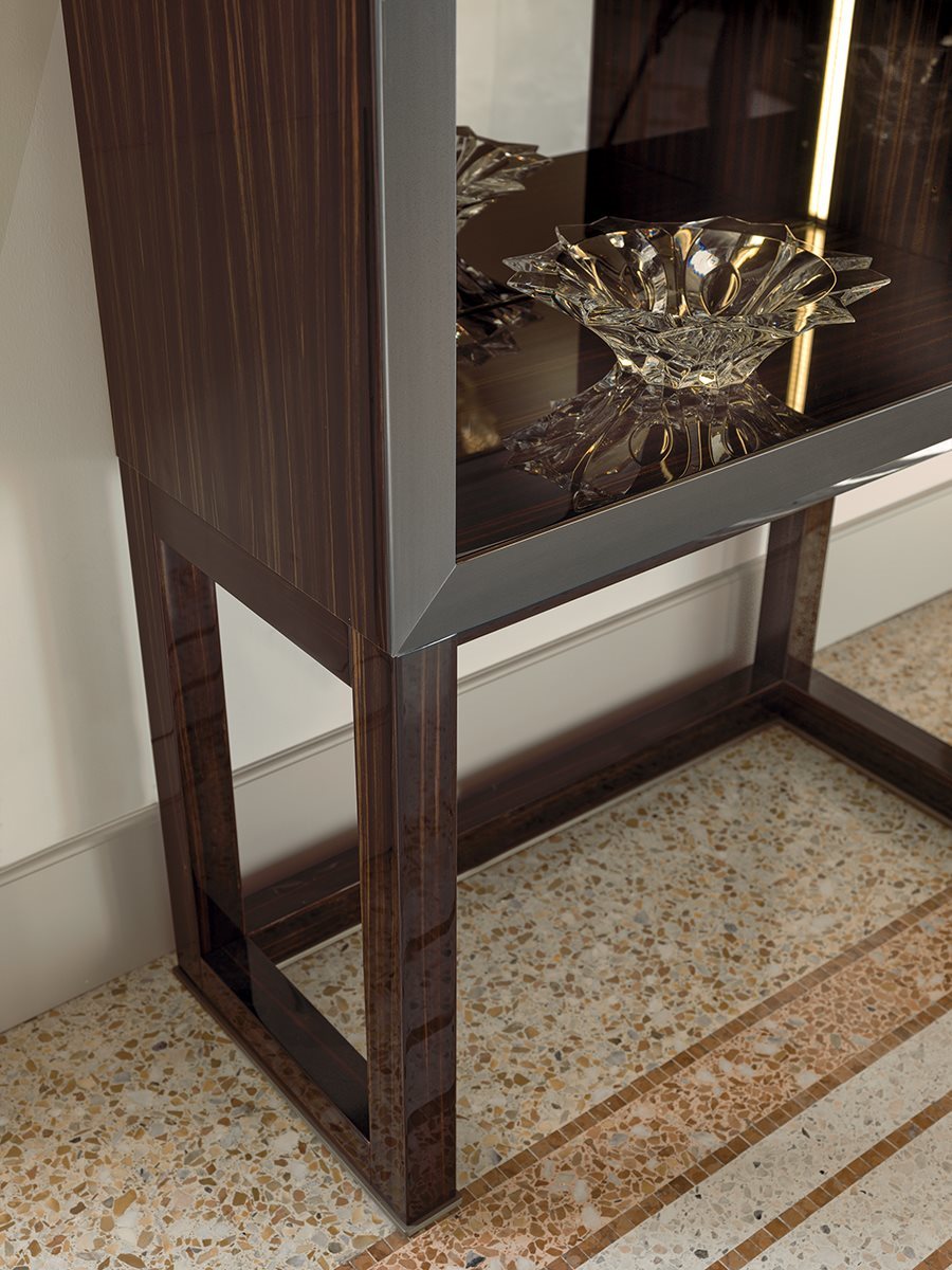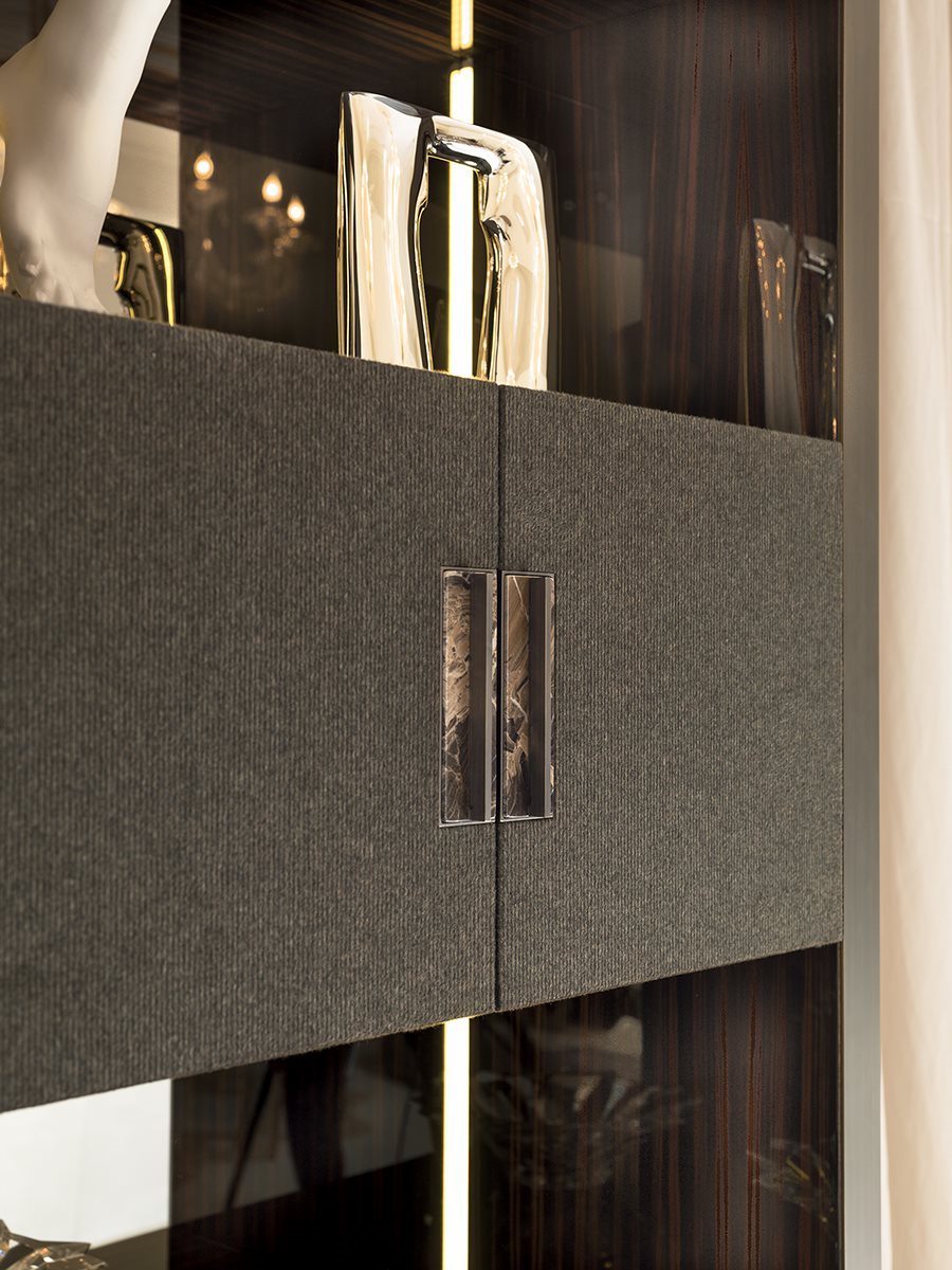 Высокий шкаф для хранения стилизован под шкаф с двумя центральными дверцами, обтянутыми кожей или кашемиром Loro Piana Interiors из ассортимента, или оформлен как витрина с двумя дверцами из бронзы или дымчатого стекла с двумя внутренними полками из прозрачного хрусталя. Основание и структура из дерева: глянцевое лакированное дерево различных цветов, глянцевое / матовое эбеновое дерево, глянцевый / матовый орех Canaletto, глянцевый / матовый Sycamore frisè. Профиль основания и рамы из шлифованного металла с отделкой: золото Black Rose, ярко-коричневый, ярко-светлое золото, матовое золото цвета шампанского, глянцевый хром, глянцевый черный хром, матовая сатинированная бронза, ярко-розовое золото, матовое розовое золото. Ручка из мрамора по выбору клиента. На задней стенке шкафа закреплено зеркало в бронзовой или дымчатой отделке. По бокам спинки две светодиодные полосы с регулируемой яркостью освещают внутреннюю часть шкафа. Они включаются сенсорным переключателем.Характеристики
