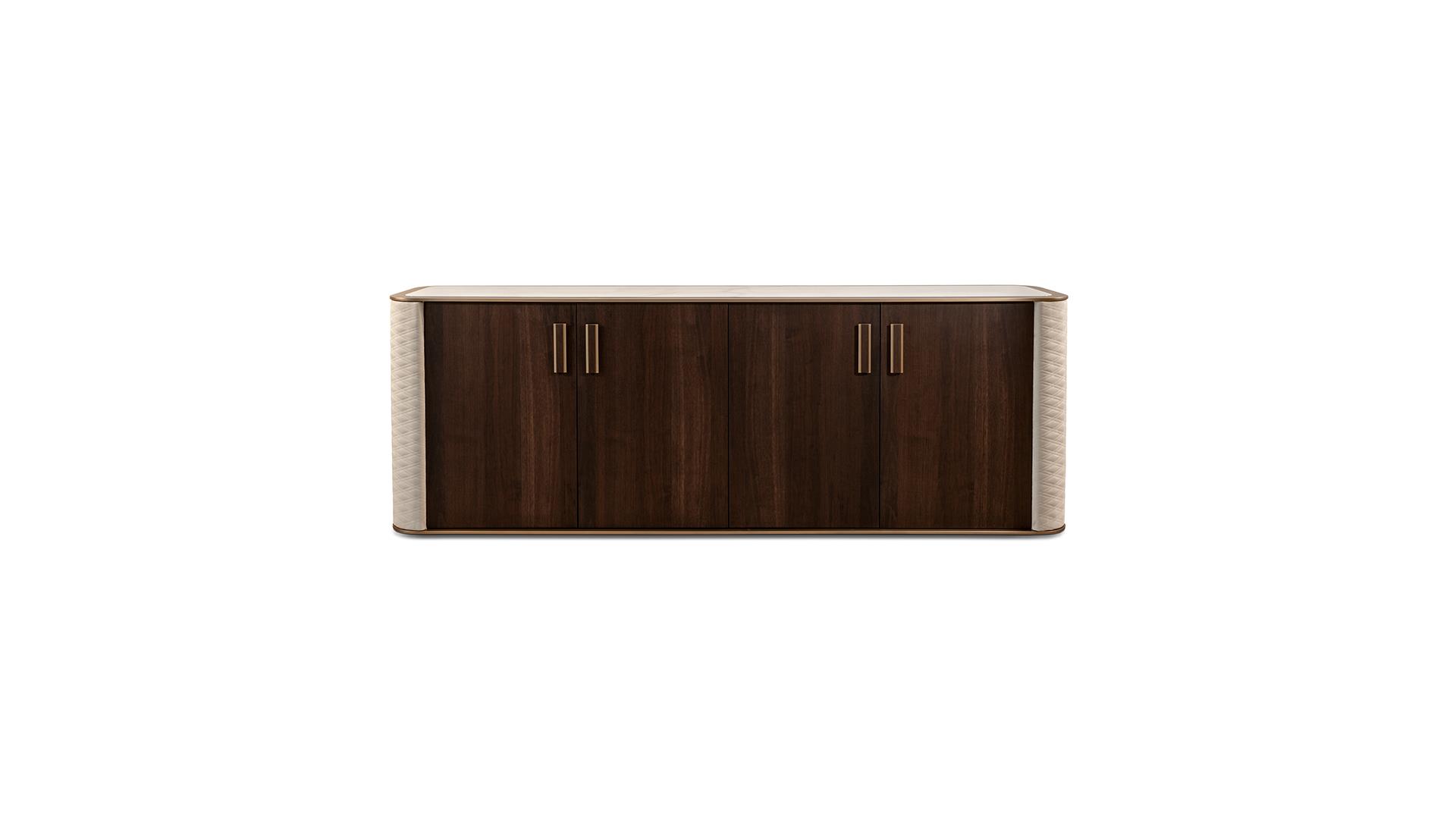 Шведський стіл з дерев'яною конструкцією. Двері з латунною ручкою з дерев’яними деталями. Сторони, обтягнуті шкірою. Верх у мармуровому склі з профілем з атласної латуні (104М). Внутрішні полички у склі.1) 4 двері