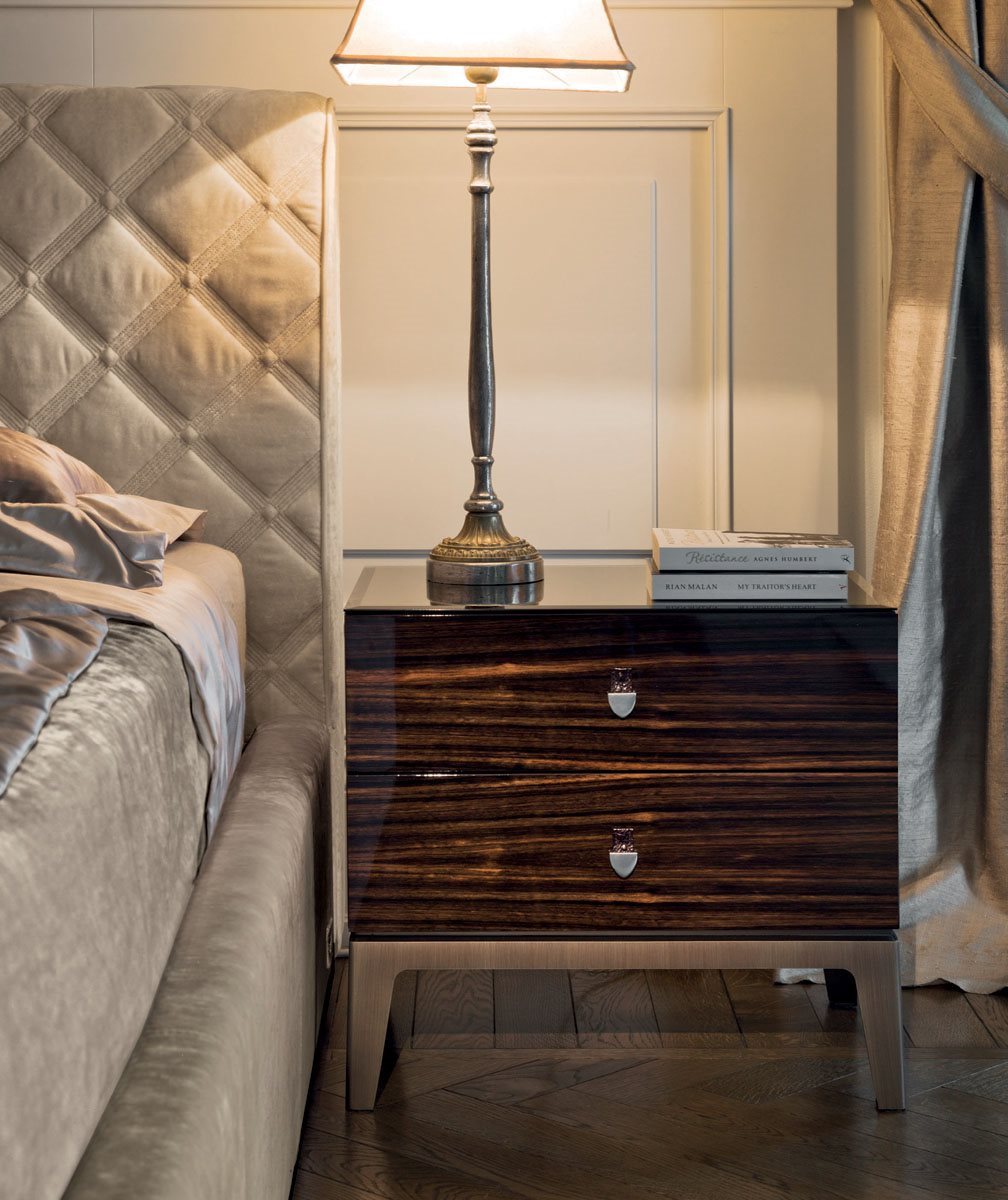 Прикроватная тумбочка с 2 ящиками из дерева в вариантах отделки: глянцевое лакированное дерево различных цветов, глянцевое / матовое эбеновое дерево, глянцевый / матовый орех Canaletto, глянцевый / матовый фризе Sycamore. Столешница с зеркальной отделкой со скошенной кромкой бронзового или дымчатого цвета. Основания из шлифованного металла с лазерной резкой в следующих вариантах отделки: ярко-коричневый, ярко-светлое золото, матовое золото цвета шампанского, глянцевый хром, глянцевый черный хром, матовая сатинированная бронза, ярко-розовое золото, матовое розовое золото, золото Black Rose.Ручки из мрамора или кожи.