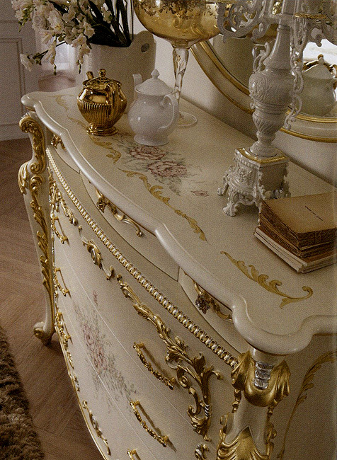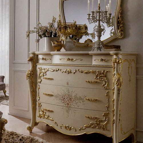 Комод с декоративными ручками и 6 выдвижными ящиками. Декорирован резьбой и росписью. Возможны другие варианты отделки.Характеристики