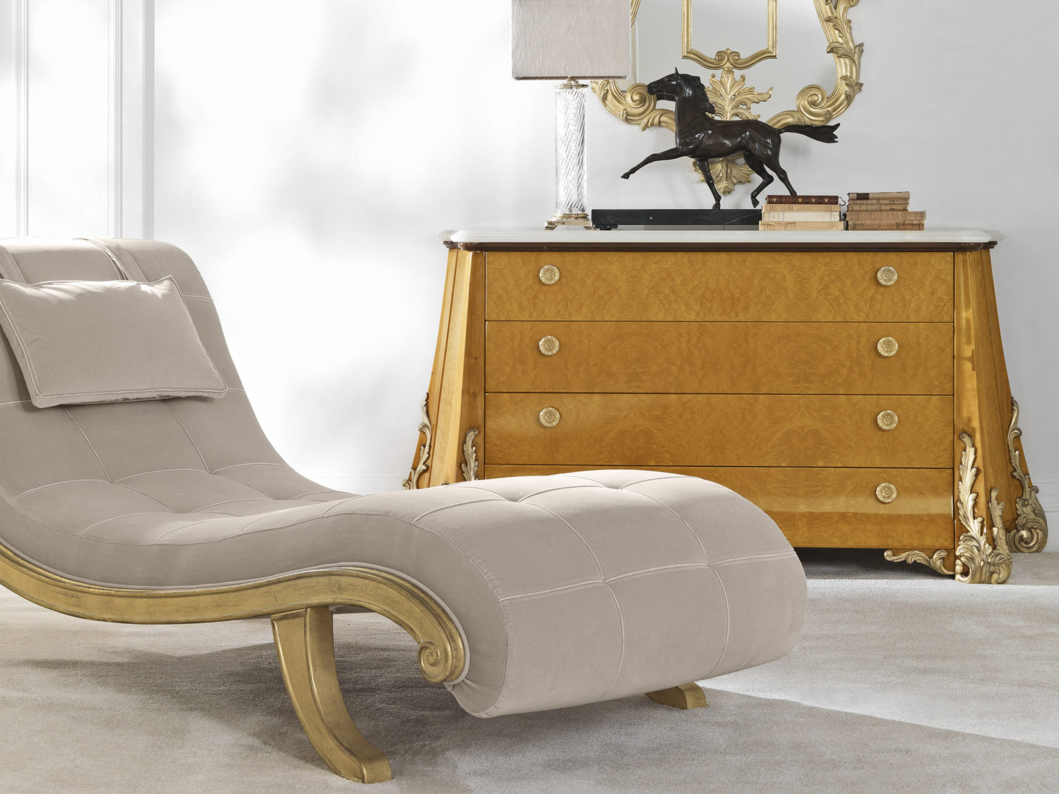 Структура из дерева, отделанного глянцевым бриаром. Четыре ящика. Детали ручной работы с патинированным покрытием под античное золото. Верх из белого мрамора Намибия Ринхо.Характеристики