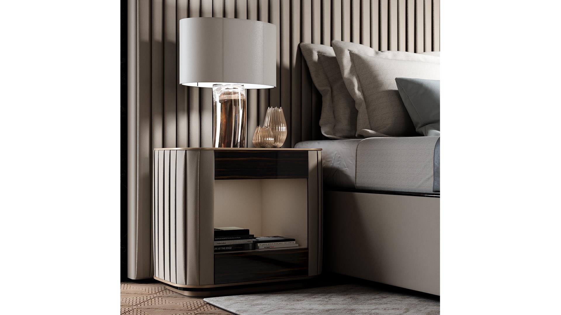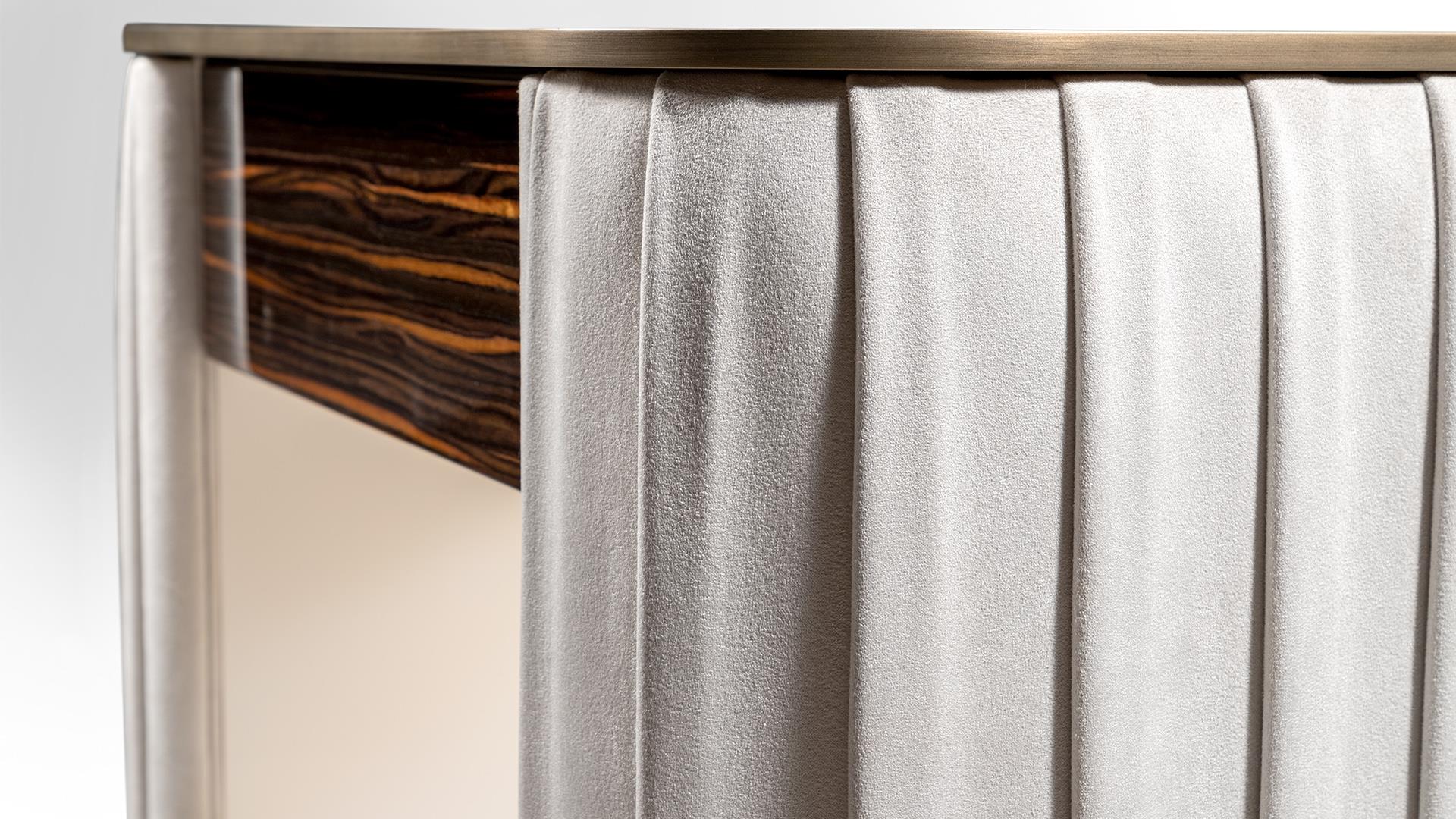 Прикроватная тумбочка с 2 ящиками из блестящего лакированного дерева или из блестящего дерева Ebony.Боковые стороны обиты гофрированной кожей или тканью. Верхняя часть из атласной латуни.