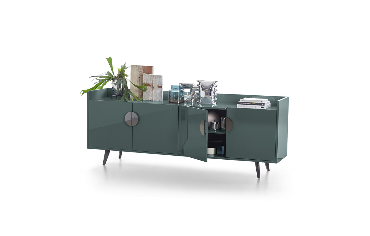 Контейнер с двумя откидными дверцами и открытыми стеллажами, внутренние полки переставные.Каркас и полочки: в МДФ (толщина 19 мм), с полиэфирным покрытием и глянцевым лаком.