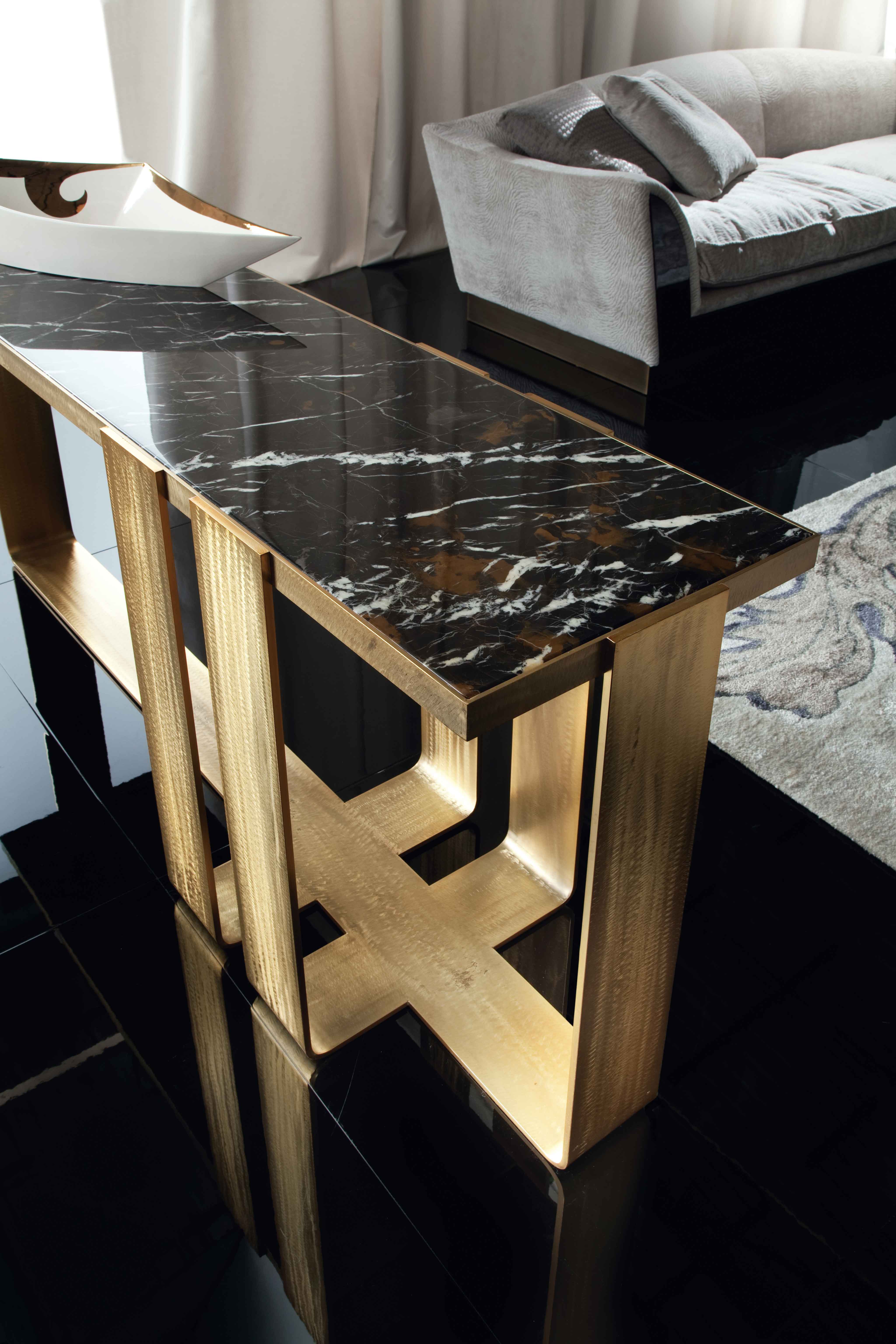 Консоль из массивной бронзовой нержавеющей стали с мраморной столешницей Madagascar Black & Gold.Характеристики