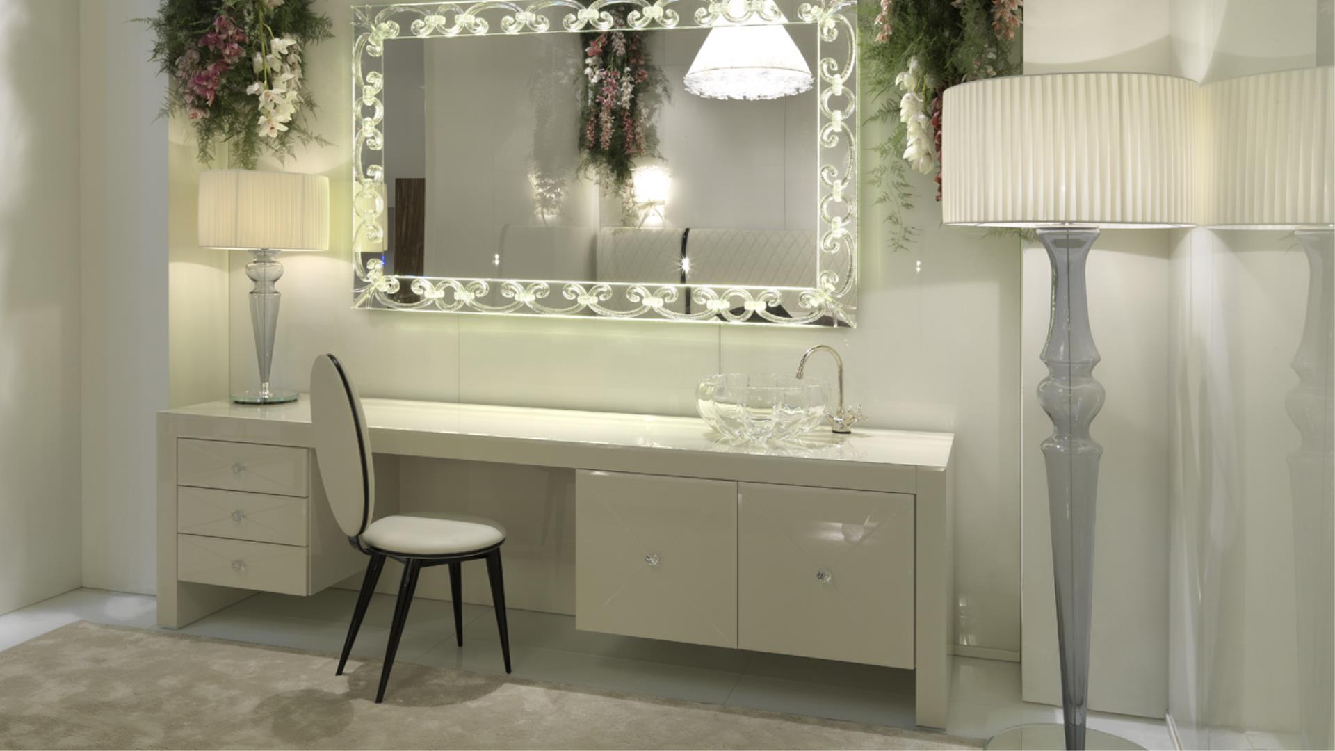 Консоль для ванной комнаты из блестящего лакированного дерева с аппликациями из лакированного стекла со скошенной кромкой. Оснащен тумбой с 4 ящиками, ящиком с 2 дверцами и умывальником из прозрачного муранского стекла. Опциональные ручки из муранского стекла или гравюры на фасадах.Характеристики