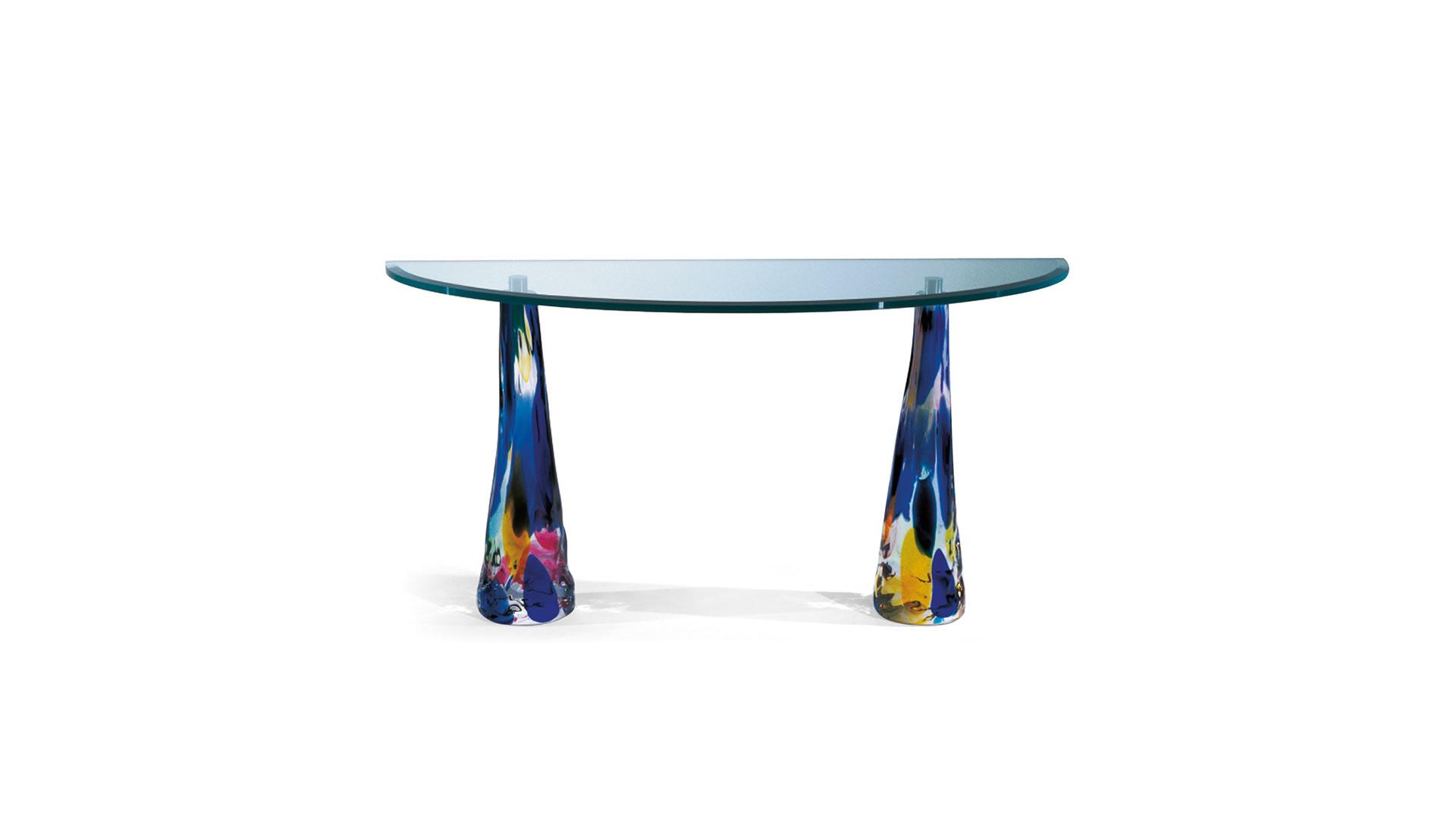 Приставка. Основания из массивного муранского стекла, разноцветные или с отделкой RUGIADA. Стеклянная столешница толщиной 15 мм со скосом 45 °.Балийские предметы (ваза, блюдо для фруктов, пепельница) являются частью коллекции, с такой же отделкой из муранского стекла.