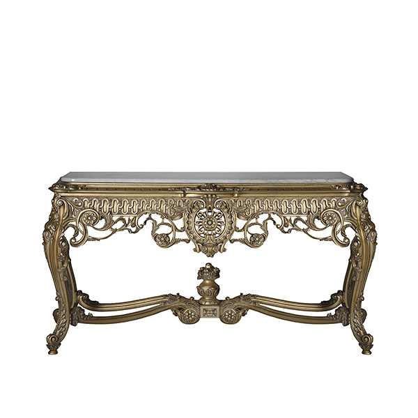 Мраморная столешница опирается на резной деревянный фриз с натуральными мотивами и центральный медальон. Он стоит на покрытых листьями ножках кабриоля, соединенных по диагонали с резной деревянной урной в центре.Характеристики