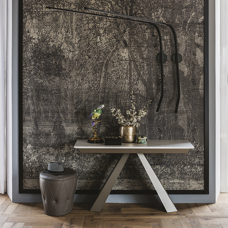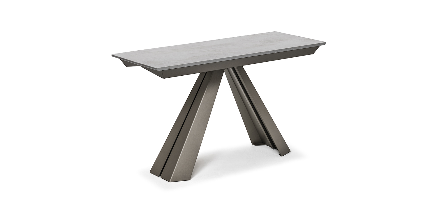 Выдвижная консоль с основанием из лакированной стали с тиснением из титана (GFM11), бронзы (GFM18), графита (GFM69) или белого (GFM71) цвета. Столешница и надставки из ламинированного дерева белого цвета (LM02), оксида серого (LM06), орехового (LM05) или цементного (LM07) цвета. Сумка для расширений в комплекте.Характеристики