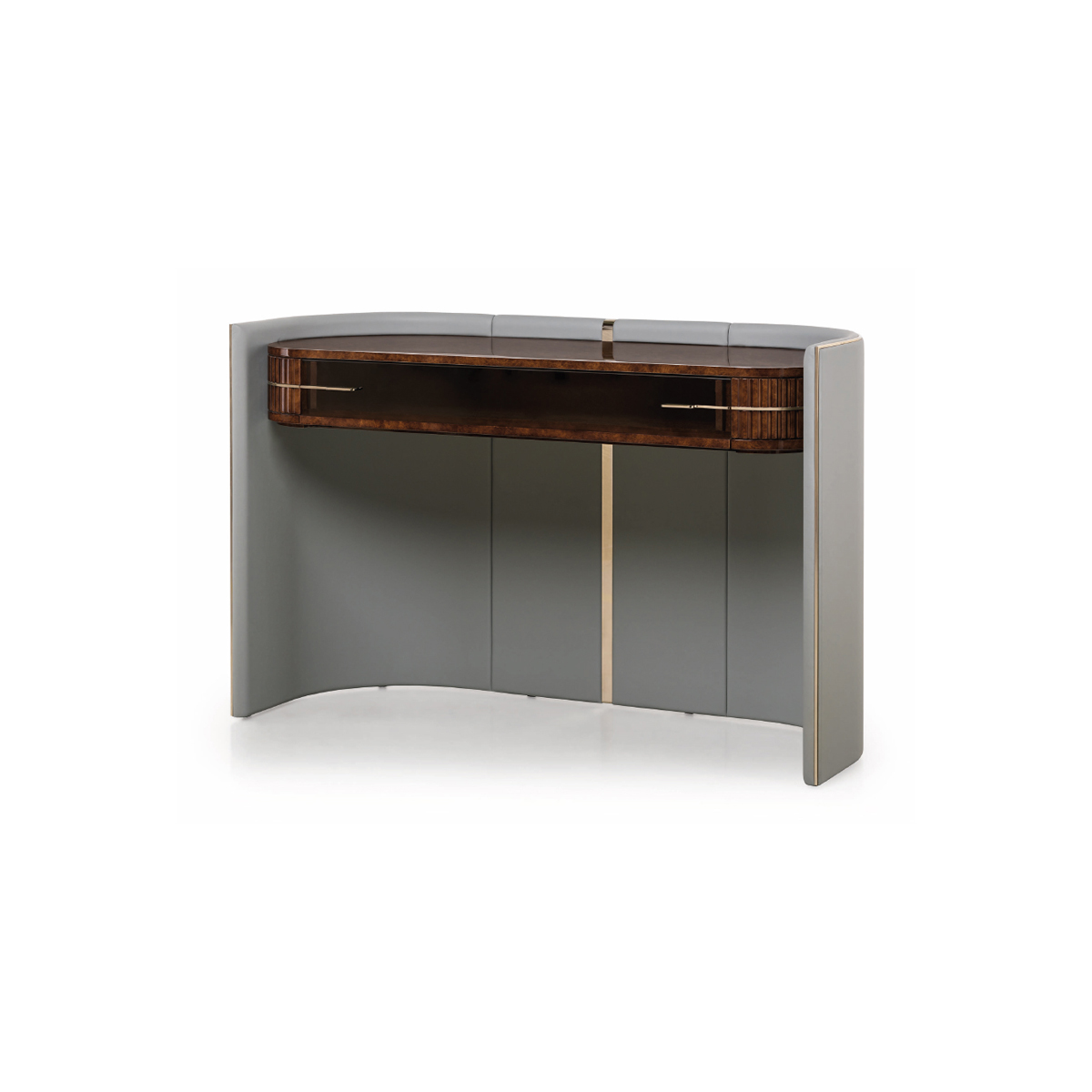 Консоль коллекции Eclipse имеет изысканный и современный дизайн, изогнутая спинка, полностью покрытая кожей, поддерживает деревянную конструкцию в отделке глянцевым лаком. Под столешницей ящик с фронтальной частью из бронзированного стекла. Детали из металла с отделкой светлое золото обрамляют структуру, обтянутую кожей, и становятся ручками на центральном ящике. Консоль коллекции Eclipse доступна в различных вариантах отделки в соответствии с образцами.Характеристики