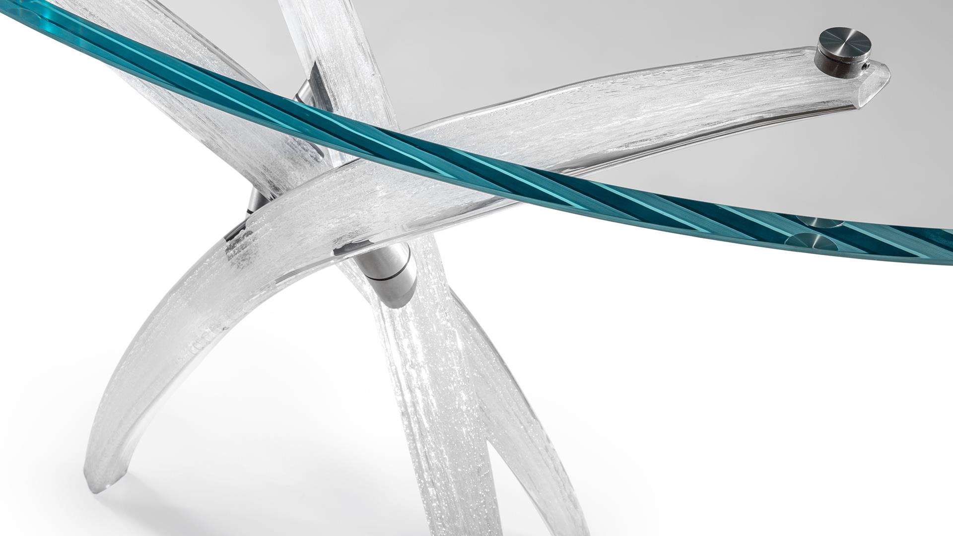 Консоль с основанием из муранского стекла доступна в вариантах отделки: белая пескоструйная обработка, руджиада, золото и муррин или кальцедонио. Стеклянная столешница толщиной 15 мм со скосом 45 °.Характеристики
