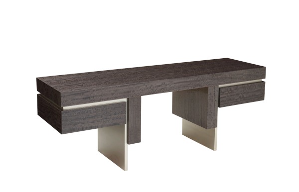 Двусторонняя консоль: ее можно использовать как на стене, так и посреди комнаты. Стальная вставка по периметру в трех новых вариантах отделки: Ice, Bronze и Honey. Новое дерево: серый эвкалипт фризе, но доступно изделие из орехового дерева и палисандра.Консоль из матового палисандра или табачного палисандра, 2 ящика, стальные детали с эффектом глазури.