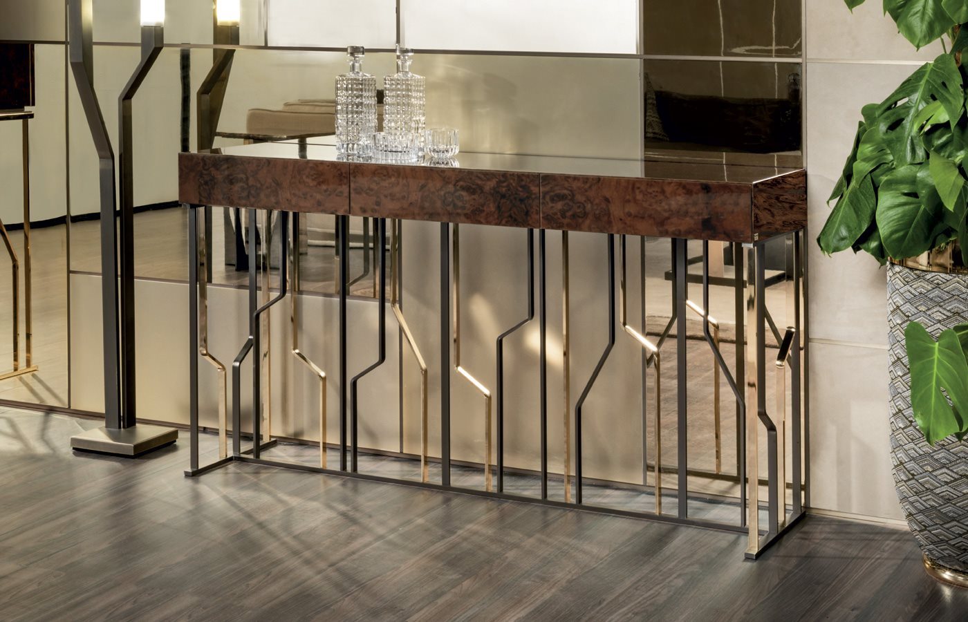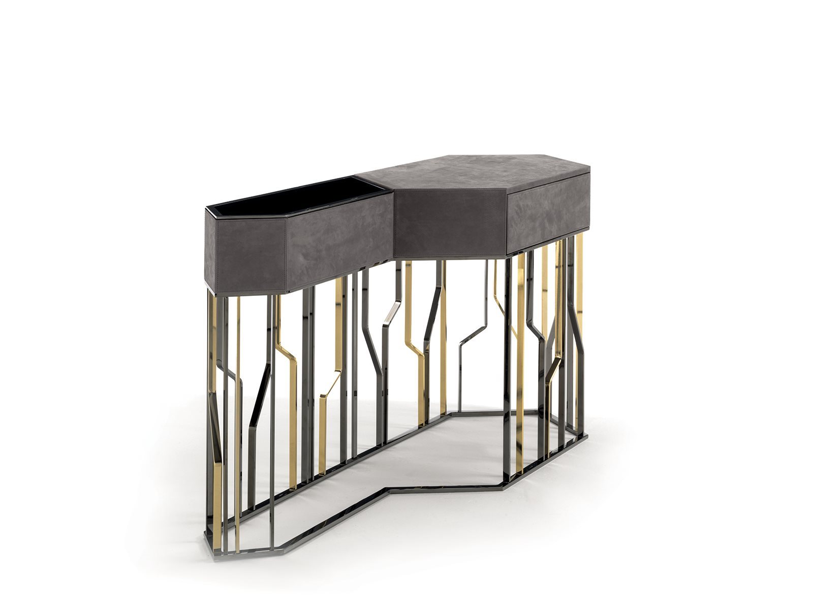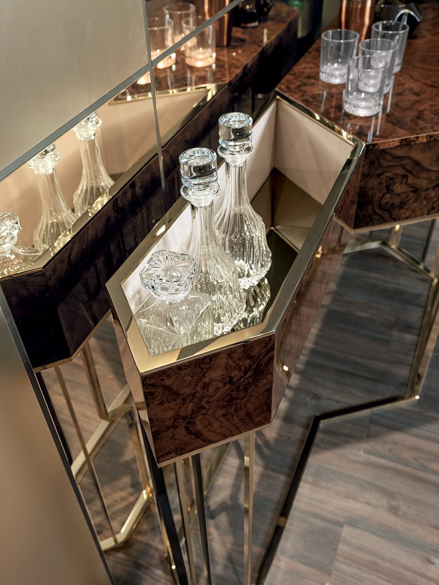 A_Version с открытым держателем для бутылок и деревянным ящиком в вариантах отделки: глянцевое / матовое эбеновое дерево, глянцевый / матовый орех Canaletto, глянцевый / матовый фризе Sycamore, глянцевый кап орехового дерева, обитый кожей в ассортименте. Внутренняя часть отсека-держателя для бутылок покрыта глянцевым лаком из линейки с дном отсека из бронзы или дымчатого зеркала. край отсека из металла с такой же отделкой, что и основание. Дно ящика обтянуто кожей кат. Стр.3 Замша. Металлическая основа, доступная в следующих вариантах отделки: черное розовое золото, ярко-коричневый оттенок, яркое светлое золото, матовое золото цвета шампанского, глянцевый хром, яркий черный хром, матовая сатинированная бронза, ярко-розовое золото, матовое розовое золото. двухцветная отделка, по запросу.B - Версия с 3 небольшими деревянными ящиками в вариантах отделки: глянцевое / матовое эбеновое дерево, глянцевое / матовое ореховое дерево Каналетто, глянцевое / матовое фризе Sycamore, глянцевый кап орехового дерева, обитая кожей из каталога. Днища ящиков обтянуты кожей кат. Стр.3 Замша. Металлическая основа, доступная в следующих вариантах отделки: черное розовое золото, ярко-коричневый оттенок, яркое светлое золото, матовое золото цвета шампанского, глянцевый хром, яркий черный хром, матовая сатинированная бронза, ярко-розовое золото, матовое розовое золото. двухцветная отделка, по запросу.