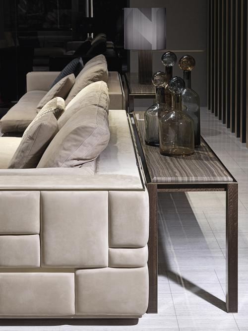 Каркас из массива дерева, ножки снаружи покрыты кожей или шпонированы, а внутри - из сатинированной стали. Каркас под столешницей обтянут кожей или облицован шпоном, столешница из мрамора с профилем по периметру из сатинированной нержавеющей стали. Деревянные детали доступны в выборе отделки шпоном. Металлические детали доступны с отделкой из сатинированного металла.Характеристики