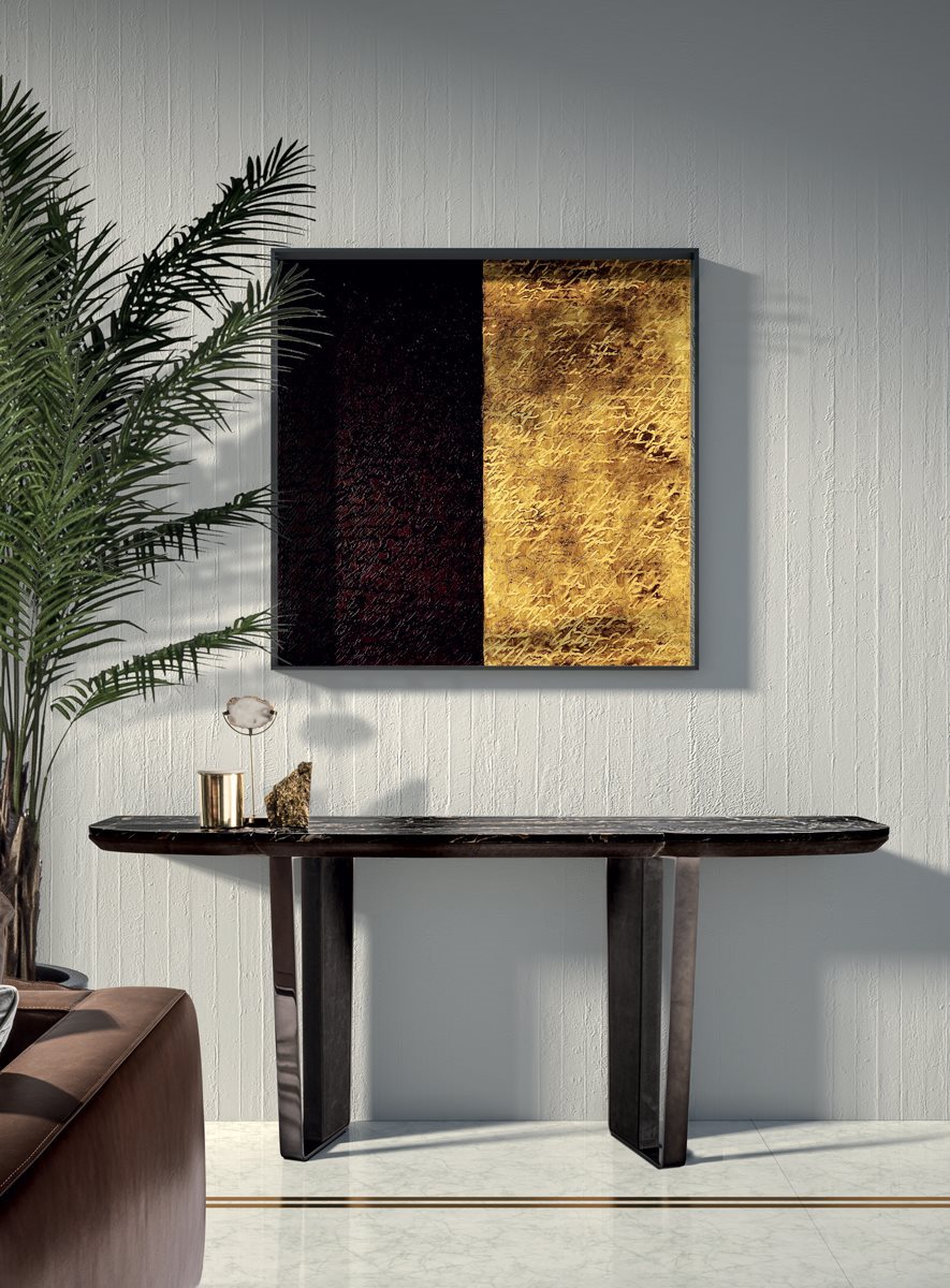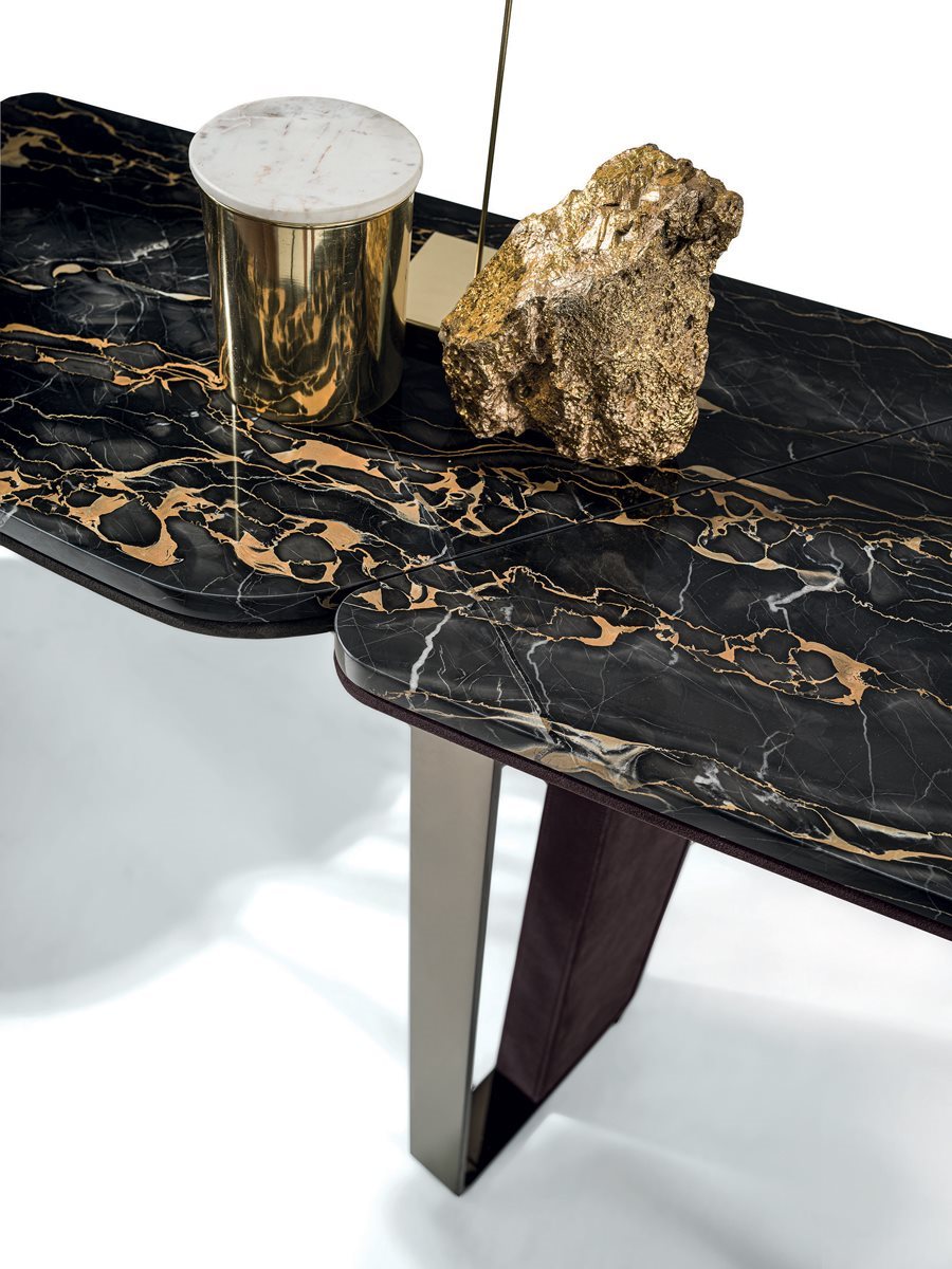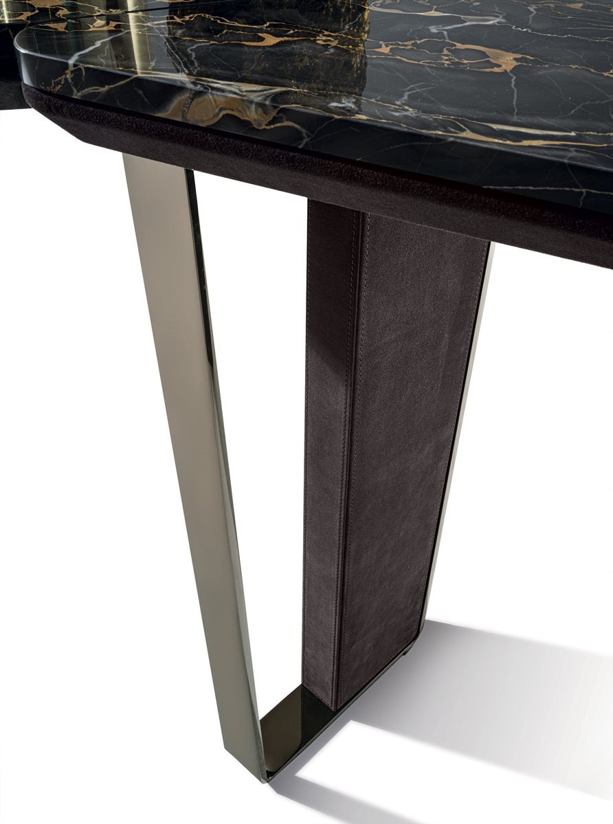 Консоль, состоящая из 2-х трапециевидных ножек и профилированного верха из разных материалов. Основание из шлифованного металла с механической обработкой и лазерной резкой в следующих вариантах отделки: золото Black Rose, ярко-коричневое, ярко-светлое золото, матовое золото цвета шампанского, глянцевый хром, глянцевый черный хром, матовая сатинированная бронза, ярко-розовое золото, матовое розовое золото. Вставка для ног обтянута кожей по каталогу или деревом: глянцевое / матовое эбеновое дерево, глянцевый / матовый макадамия, окрашенный под орех Canaletto, глянцевый / матовый Sycamore frisè. Нижний слой обтянут кожей из каталога, при желании в тон вставки на штанине. Верх, разделенный на 3 части, имеет отделку: мрамор Emperador Dark, мрамор Guatemala Green, мрамор Bardiglio Nuvolato, мрамор Shale Rosewood, мрамор Silver Wave, мрамор Agatha Black, мрамор Calacatta Gold, мрамор Dover White, мрамор Red Levanto, Elegant Коричневый мрамор, мрамор Frappuccino, мрамор Corteccia, мрамор Panda White, мрамор Sahara Noir (полиэфирная отделка), мрамор Port Saint Laurent, мрамор Fusion Light, мрамор Patagonia, мрамор Explosion Blue, мрамор Fusion Multicolor, мрамор Juliet Quartz, мрамор Azul Macauba, Portoro мрамор (оникс по запросу) или дерево: глянцевое / матовое эбеновое дерево, глянцевый / матовый макадамия, окрашенный под орех Canaletto, глянцевый / матовый Sycamore frisè.Характеристики