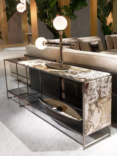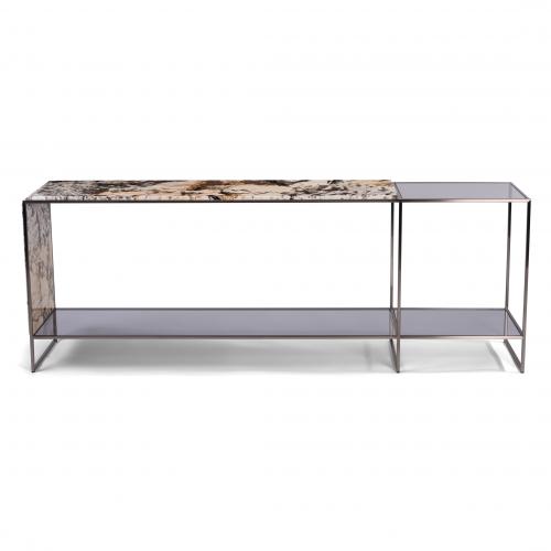 Квадратная рама из сатинированной стали с невидимыми сварными швами, полка из особо прозрачного или дымчатого хрусталя. Верх и боковая панель из мрамора с прожилками. Доступен в высоком исполнении с двумя ящиками из полированного лакированного дерева (цвет RAL / NCS). Крепление к стене. Металлические детали можно отделать любым лаком на выбор. Столешница из мрамора Rainforest может быть отделана также декоративной гравировкой Linfa с микроотражением.Верх и сторона доступны в мраморе: Patagonia, Dalmata. Россо Леванто, Тропический лес.