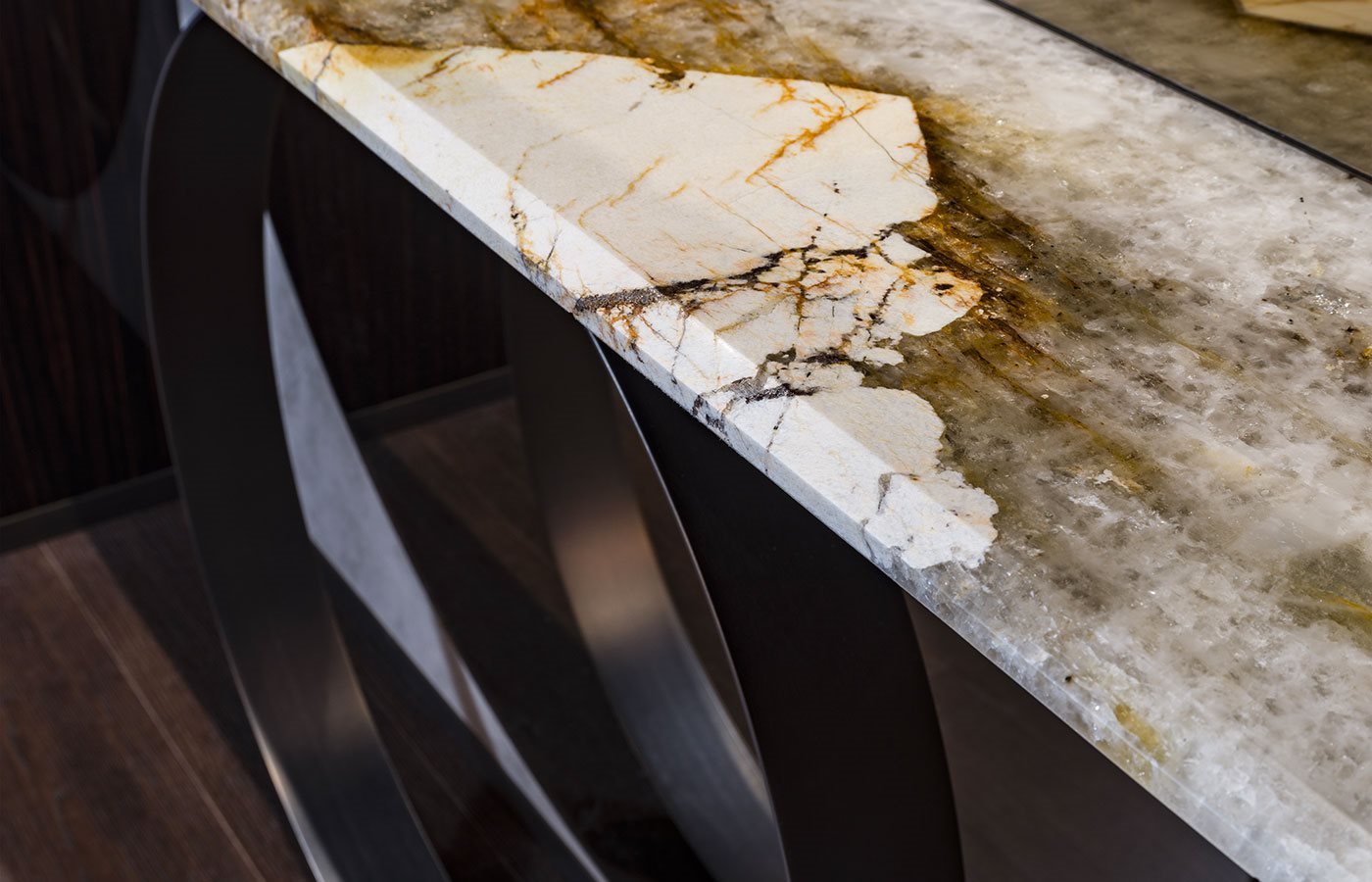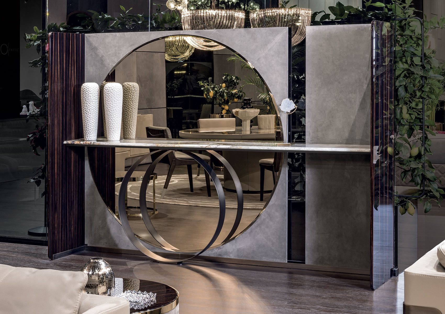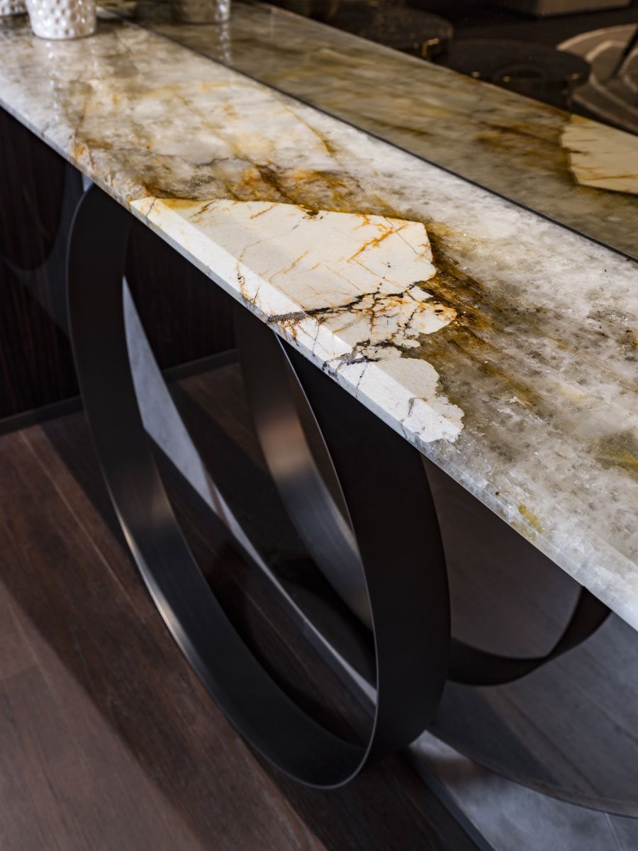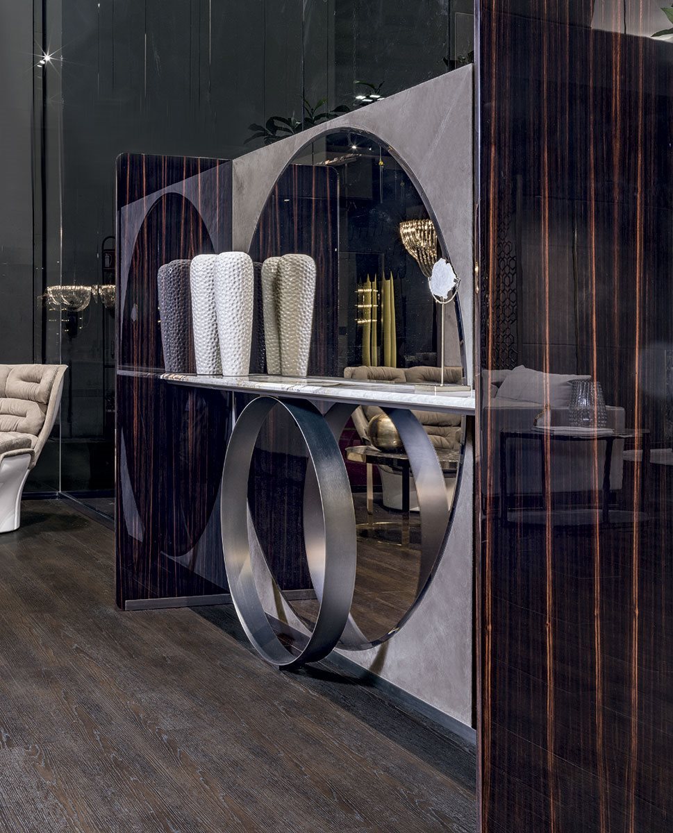 Входная консоль с деревянными стенками: глянцевое Ebony, глянцевый орех Canaletto. Салон обшит кожей P.3 Кат. Замша с круглым нейтральным, бронзовым или дымчатым зеркалом. Варианты отделки полки: - бронзовое или дымчатое зеркало со скосом, Мрамор th. 20 мм со скосом 20 мм: мрамор Sahara Noir (полиэфирная отделка), мрамор Dover White, мрамор Panda White, мрамор Guatemala Green, мрамор Corteccia, мрамор Port Saint Laurent, мрамор Red Levanto, мрамор Bardiglio Nuvolato, мрамор Elegant Brown, мрамор Shale Rosewood , Мрамор Emperador Dark, мрамор Silver Wave, мрамор Agatha Black, мрамор Frappuccino, мрамор Calacatta Gold, мрамор Fusion Light, мрамор Patagonia, мрамор Explosion Blu, мрамор Fusion Multicolor, кварцевый мрамор Juliet. Древесина по бокам: глянцевое Ebony, глянцевый орех Canaletto. Полка поддерживается шлифованным металлическим кольцом в следующих вариантах отделки: золото Black Rose, ярко-коричневое, ярко-светлое золото, матовое золото цвета шампанского, глянцевый хром, яркий черный хром, матовая сатинированная бронза, ярко-розовое золото, матовое розовое золото.Характеристики