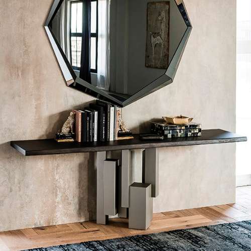 Консоль с основанием из лакированной стали с тиснением из титана (GFM11), графита (GFM69) или черного (GFM73). Столешница из ореха Каналетто (NC), обожженного дуба (RB) или натурального дуба (RN) с неровными краями из массива дерева. Крепление к стене необходимо.Характеристики