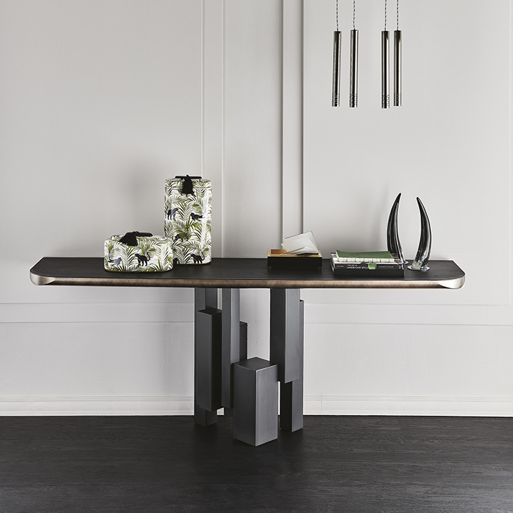 Консоль с основанием из лакированной стали с тиснением из титана (GFM11), графита (GFM69) или черного (GFM73). Столешница из ореха Каналетто (NC) с лакированным покрытием Brushed Grey и закругленным нижним профилем или с открытыми порами вяза, матово-черный (OLM73) с лакировкой Brushed Bronze и закругленным нижним профилем. Крепление к стене необходимо.Характеристики