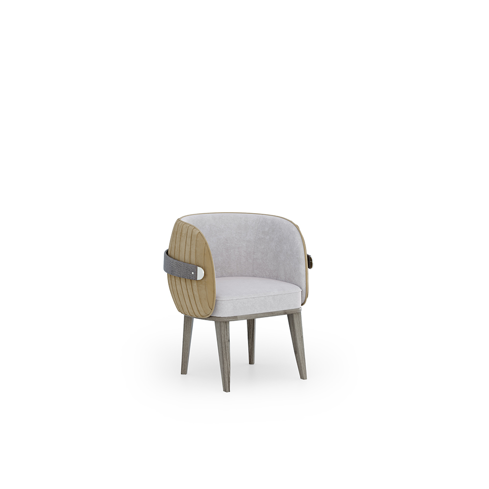 Обивка спинки стула выполнена в технике плиссе. Декоративный металлический обод, обтянутый кожей. Деревянные основание и ножки.Характеристики