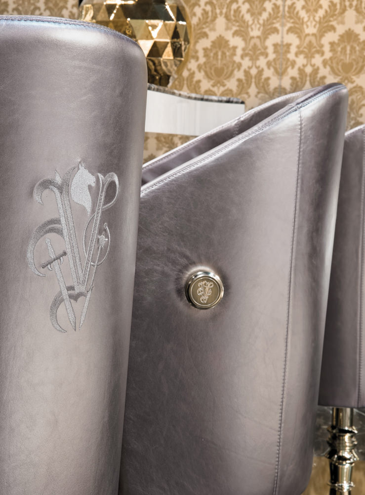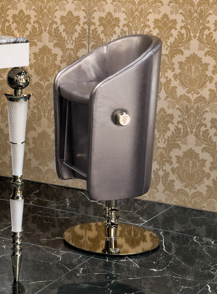 Задняя часть из гнутой фанеры из тополя 18 мм. Обивка сиденья D. 45 кг / м3, все покрыто слоем Memory Foam® на 2 см. Обивка спинки D. 40 кг / м3. Основание из полированной нержавеющей стали с логотипом из латуни и стабилизирующая масса из железа, обточенная ножка из алюминия и хромированной стали с газовым пневматическим цилиндром. Подставка для ног из нержавеющей стали с планкой из сатинированной стали, держатель для сумок из алюминия с выгравированным логотипом Visionnaire, доступен в версии с хромированной отделкой или с золотым лаком. Доступен также в версии с регулируемой высотой (высота сиденья от 58 см до 82 см).Характеристики