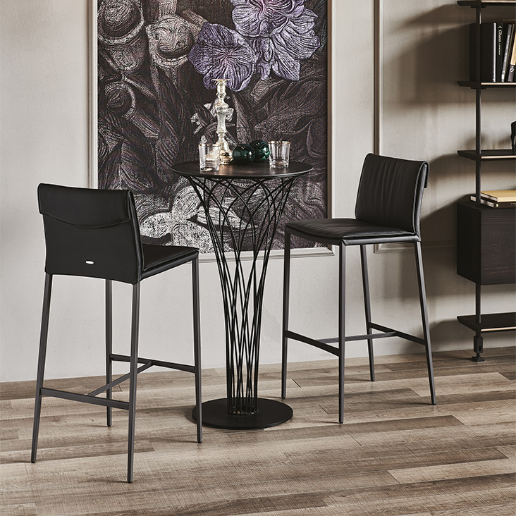 Стул со структурой из стали, лакированной белой (OP71), графитовой (OP69), лакированной стали с тиснением под титан (GFM11) или бронзой (GFM18). Подушки и чехол из ткани, синтетического нубука, микронубука, синтетической кожи или мягкой кожи согласно образцу. Крышка несъемная.Характеристики