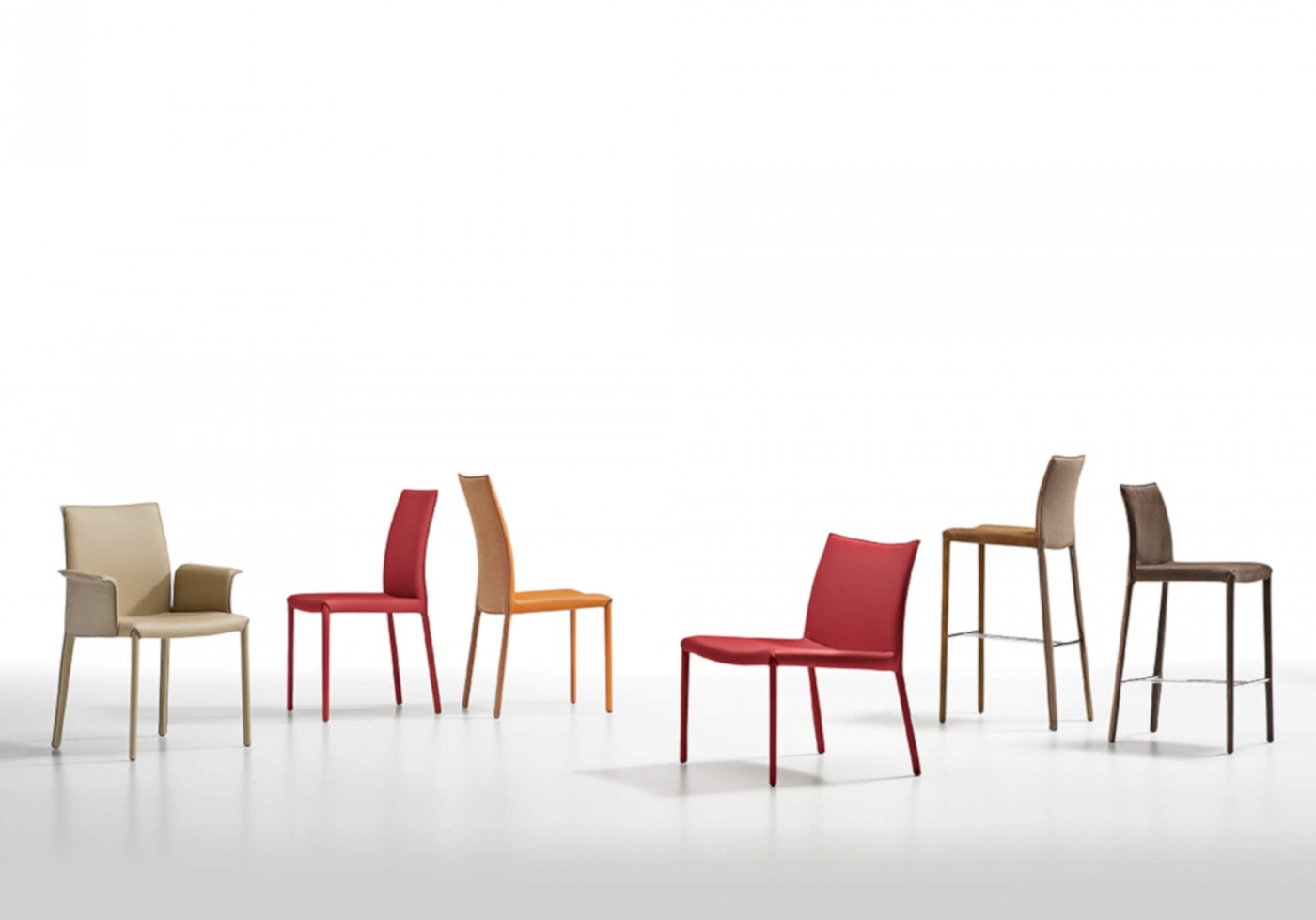 Стул с четырьмя ножками из лакированной стали или полностью обшит кожей, регенерированной кожей, кожей, экокожей, тканью или тканью по индивидуальному заказу. Возможность обивки тыльной стороны другой тканью, кожей или экокожей.Характеристики