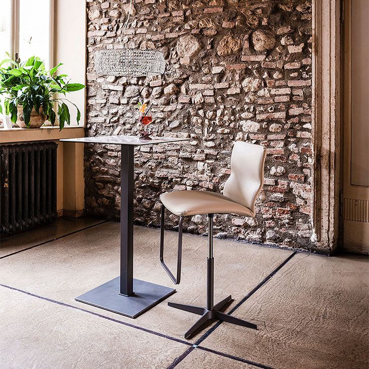 Поворотный сверхлегкий табурет, регулируемый по высоте, с основанием из 4 спиц из полированного алюминия и стойкой, подставкой для ног и газовым поршнем из хромированной стали (08) или с опорной пластиной, стойкой и подставкой для ног из черной (GFM73) или титановой (GFM11) лакированной стали с тиснением и газовый поршень из хромированной стали (08). Каркас обтянут тканью, синтетическим нубуком, микронубуком, синтетической кожей или мягкой кожей согласно образцу. Опущенный поршень позволяет использовать табурет как стул.Характеристики