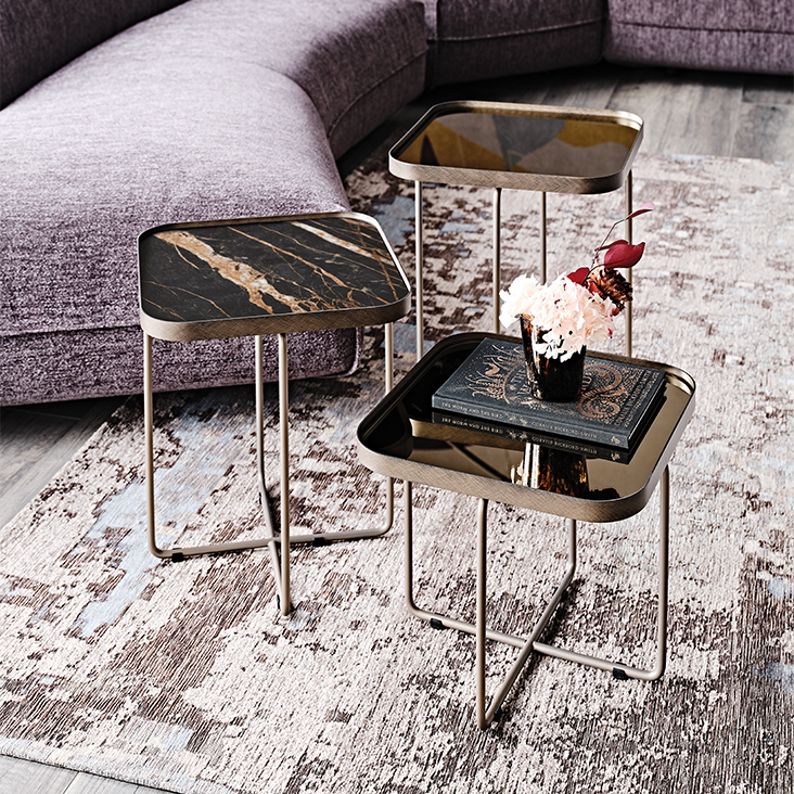 Журнальный столик с рамой из тисненого титана (GFM11) или черной (GFM73) лакированной стали, или с основанием из бронзы и верхней рамой из матовой бронзы. Зеркальная столешница из бронзового стекла.Характеристики