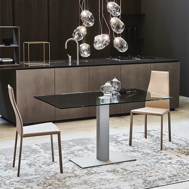 Стол с основанием из титана (GFM11), графита (GFM69), белой (GFM71) лакированной стали с тиснением или с основанием из сатинированной нержавеющей стали и колонной из полированной нержавеющей стали. Столешница из прозрачного стекла толщиной 15 мм.Характеристики