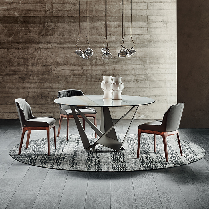 Стол с основанием из титана (GFM11), бронзы (GFM18), графита (GFM69), белой (GFM71) или черной (GFM73) лакированной стали с тиснением, матовой бронзы или матовой серой. Столешница из керамики Marmi in Alabastro (KM02), Supreme (KM03), Ardesia (KM04), матовый Golden Calacatta (KM05), глянцевый Golden Calacatta (KM06), матовый Portoro (KM07), глянцевый Portoro (KM08), глянцевый Sahara Noir ( KM09), Emperador (KM10), Makalu (KM11), Breccia (KM12) или Arenal (KM13). Дополнительный центральный поворотный поднос Lazy Susan.Характеристики